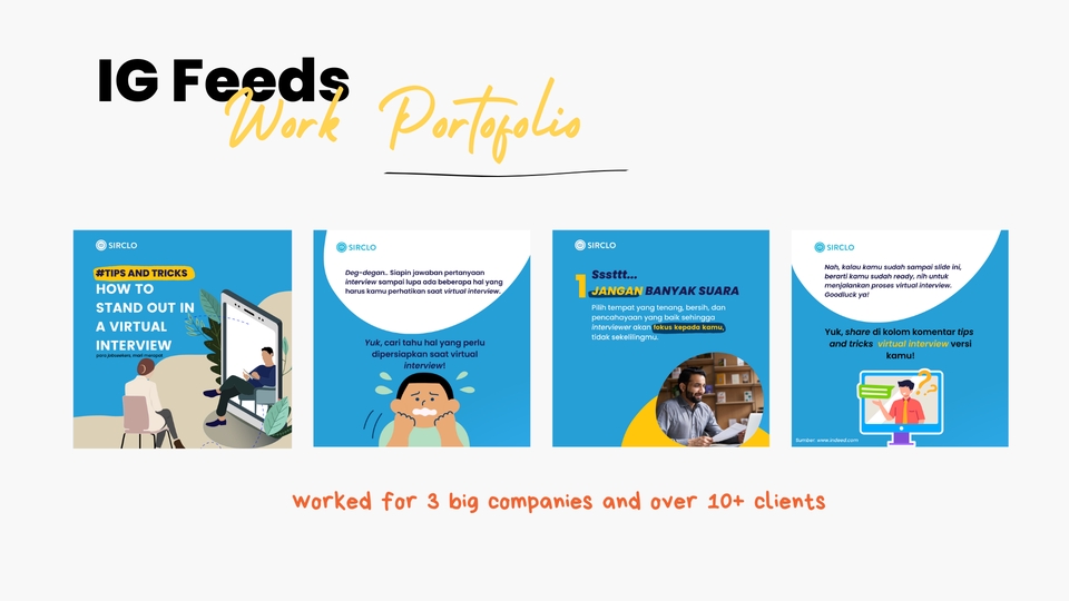 I have gained valuable experience as a content creator, collaborating with various organizations, including SIRCLO in the Employer Branding division, a corporate health company within the Human Capital division, Culture and Engagement and Prodia Corporate University at PT Prodia Wisyahusada Tbk. Additionally, I have been actively involved in both campus and off-campus organizations. And almost all the content i’ve created is about branding the employee and self-development related to company culture. Langkah Pekerjaan 1. Freelancer akan melakukan brainstroming mengenai content 2. Dealing the price 3. Freelancer akan mengerjakan sesuai perjanjian 4. Revisi Client (maks. 2 kali) 5. Approval Client