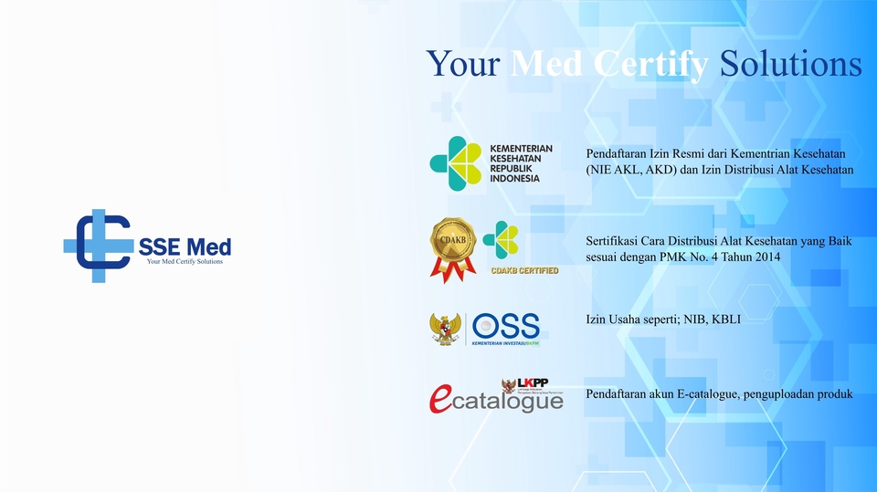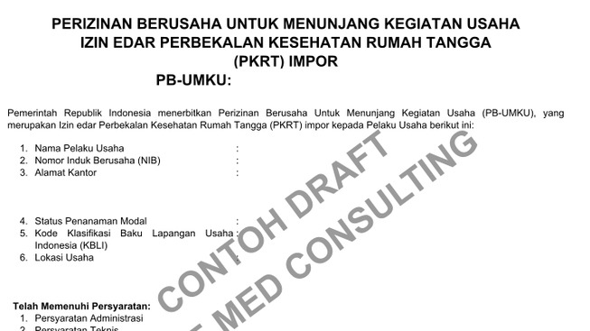 CSSE Med menyediakan layanan profesional untuk pengurusan izin Perbekalan Kesehatan Rumah Tangga (PKRT) meliputi produk impor (PKL), produk lokal (PKD), serta Sertifikasi Cara Produksi PKRT yang Baik (CPPKRTB). Dengan tenaga ahli berlatar belakang farmasi dan apoteker, kami memastikan proses berjalan cepat, sesuai regulasi Kementerian Kesehatan, dan terjamin legalitasnya. CSSE Med berkomitmen membantu perusahaan Anda memperoleh izin edar PKRT secara efisien, aman, dan sesuai standar mutu yang berlaku. Langkah Pekerjaan: 1. Konsultasi awal untuk memastikan izin apa yang dibutuhkan 2. CSSE Med akan mengirimkan list dokumen persyaratan sesuai dengan paket yang dipilih 3. Klien melengkapi dan mengirimkan dokumen yang dibutuhkan sesuai persyaratan 4. Klien membayar invoice sesuai dengan kesepakatan dan CSSE Med akan memproses setelah pembayaran 5. Menunggu waktu evaluasi dari Kementerian Kesehatan 6. Permintaan dokumen tambahan, re-submit dan evaluasi kembali 7. Izin terbit 8. Jaminan keamanan data klien 100% dan bebas konsultasi