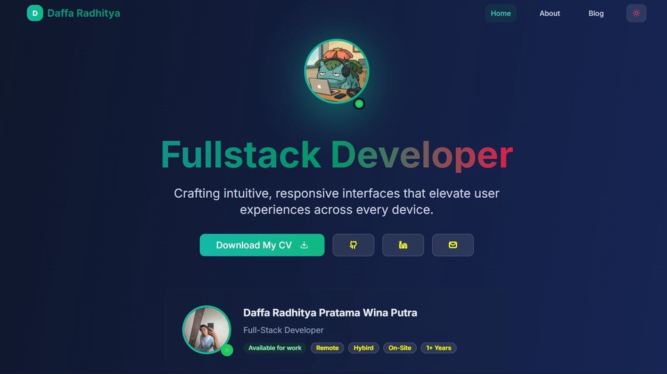 Fullstack Developer at a startup, skilled in building modern, scalable websites using React, Next.js, Nest.js, and Express.js. I turn design ideas into functional platforms and am open to new JavaScript-based web projects and collaborations.