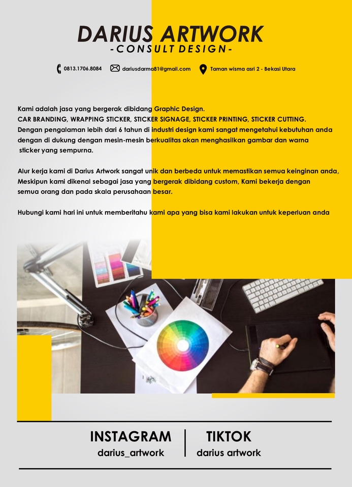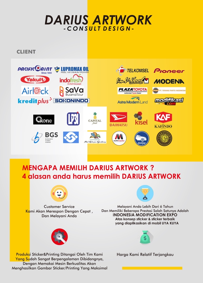 Untuk membangun suatu perusahaan kurang lengkap kalau anda belum mempunyai company Profile, selain untuk identitas company Profile juga sangat berperan untuk mendapatkan project ke klien.. Anda sudah ditempat yang benar 😄 Anda cukup menyiapkan materi gambar dan tulisan apa yang ingin dimasukkan ke dalam company Profile.. Pengerjaan memakan waktu kurang lebih 3 hari. Tergantung banyaknya halaman.. File yang didapat: Cdr - Pdf - EPS File siap cetak