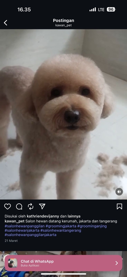 Kawan pet, menerimanya salon hewan panggilan ke rumah ke Jakarta dan tangerang Berikut layanan yang tersedia; -Cukur botak -Cukur model -Mndi anti jamur dan anti kutu -Mandi biasa Semua layanan di atas termasuk gunting kuku, Bersih telinga, gunting telapak, gosok gigi dan parfum.