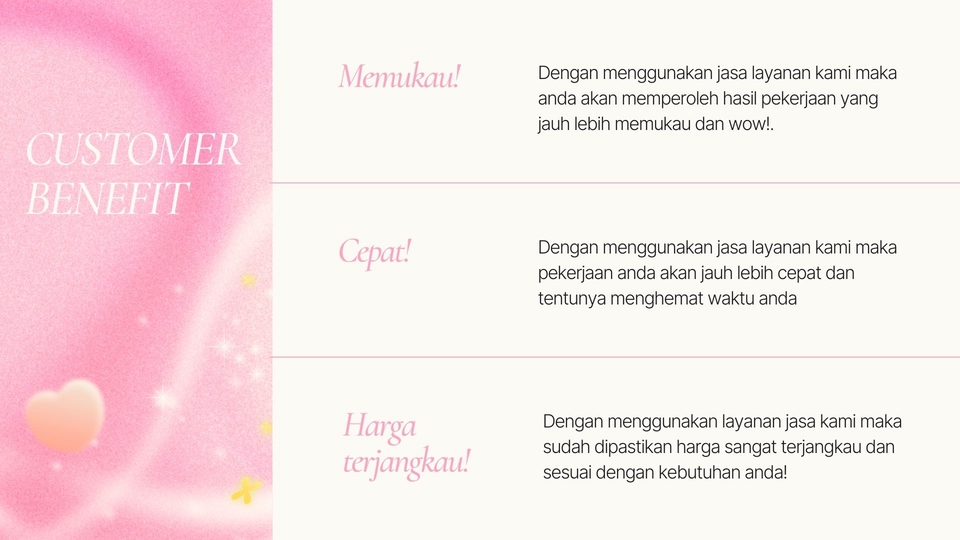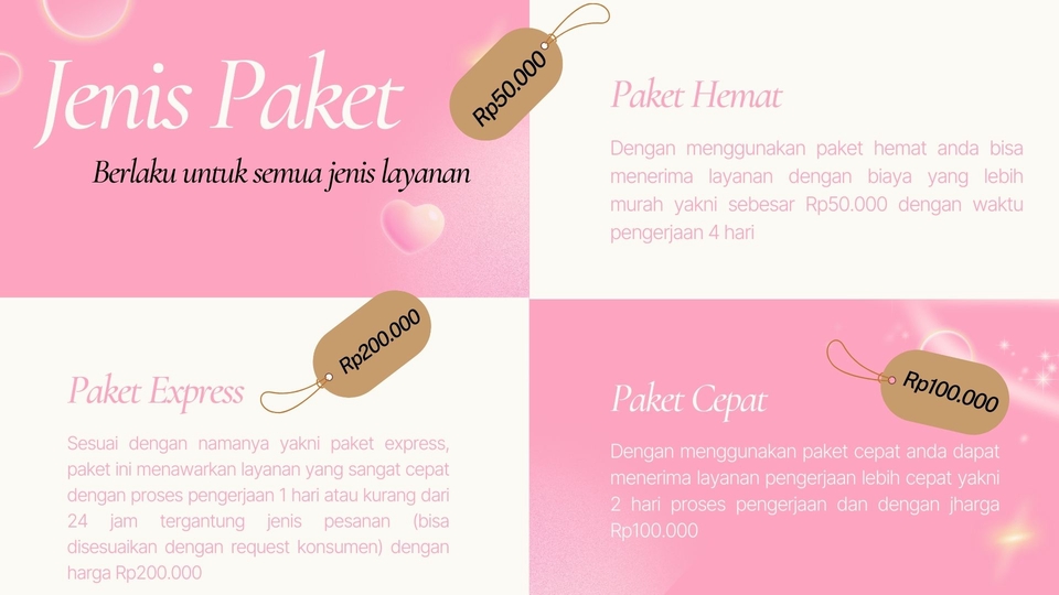 Rp50,0 rbPaket hemat ini memberikan keringanan di dalam biaya pembayaran jasa (sudah termasuk semua jenis jasa yang ditawarkan) namun untuk waktu pengerjaan disesuaikan dengan urutan pemesanan