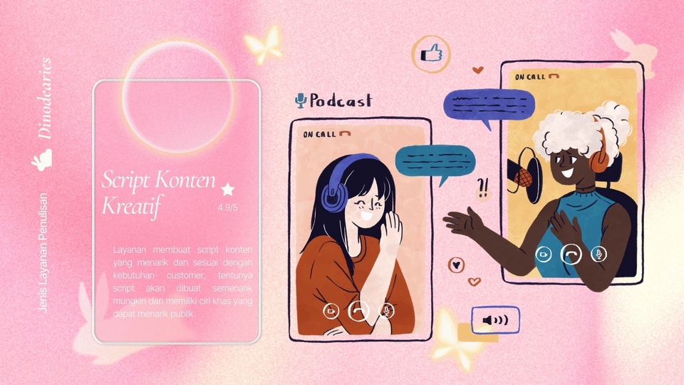 Saya menawarkan jasa penulisan berupa script konten kreatif, penulisan script konten kreatif ini tentunya akan disesuaikan dengan kebutuhan customer dan script akan dibuat dengan menggunakan kata-kata kreatif yang akan menarik perhatian publik. Langkah Pekerjaan 1. Berkoordinasi dengan customer terkait kesepakatan paket dan pesanan 2. Mendata pesanan dan mengurutkan sesuai paket 3. Mencari dan mengerjakan pesanan 4. Pengecekkan pesanan oleh customer 5. Fiksasi dan Pembayaran