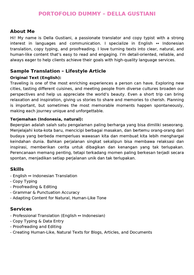 English–Indonesian Translation Service I provide translation for articles, documents, school tasks, and light content from English to Indonesian or the other way around. ✅ Manual translation ✅ Easy-to-read language ✅ Revisions based on package ✅ Fast and friendly communication Feel free to send your file or chat me before ordering!