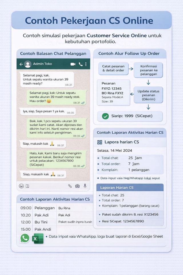 Saya menyediakan layanan Customer Service/Admin Online untuk membantu bisnis Anda berjalan lebih rapih dan responsif. Saya menangani balas chat pelanggan, follow up order, pencatatan sederhana, dan support harian dengan komunikasi yang ramah dan proffesional. Berpengalan lebih dari 10 tahun sebagai Customer Service di Perbankan. Cocok untuk UMKM, toko online, dan bisnis yang butuh CS Online terpercaya. Harga mulai dari Rp. 200.00 dapat disesuaikan dengan kebutuhan pekerjaan.
