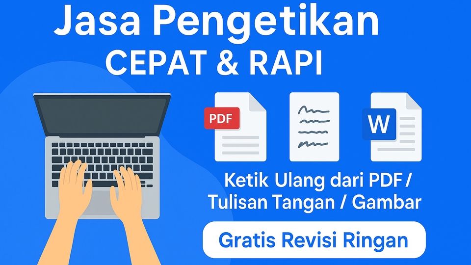 Saya menawarkan jasa pengetikan dokumen dari berbagai sumber seperti PDF, tulisan tangan, foto, atau file scan, menjadi dokumen digital rapi (Word atau Google Docs). Layanan ini cocok untuk Anda yang membutuhkan hasil pengetikan cepat, akurat, dan bebas typo. 📌 Layanan yang saya tawarkan: Mengetik ulang dokumen (tugas, skripsi, laporan, buku) Mengetik dari PDF, tulisan tangan, atau gambar Format rapi sesuai permintaan (margin, font, spasi, heading) File akhir dalam format Word, PDF, atau sesuai kebutuhan Anda 💡 Kenapa pilih saya? Pengetikan cepat dan teliti (bisa selesai dalam 1 hari*) Gratis revisi minor Privasi dan kerahasiaan dokumen Anda terjamin Silakan kirim file Anda dan saya akan mulai segera! Jangan ragu untuk bertanya sebelum order 😊 Langkah Pekerjaan 1. Pelanggan mengirimkan dokumen yang ingin diketik 2. Saya mulai proses pengetikan sesuai format yang diminta 3. Dokumen dikirim ke pelanggan untuk dicek 4. Revisi dilakukan jika ada koreksi minor 5. Pekerjaan selesai dan file final dikirim