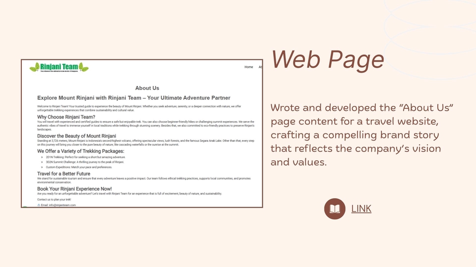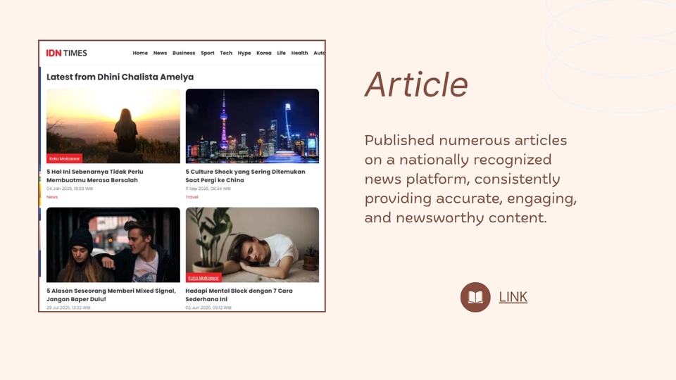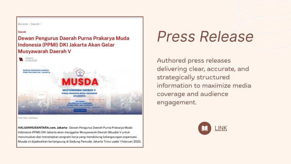 Content and copywriting - Penulisan artikel, blog, content web, press release (bahasa indonesia atau bahasa inggris), baik untuk kepentingan promosi maupun pemberian informasi. - Tulisan akan dibuat sesuai permintaan - Bisa request bahasa indonesia/inggris - Dikerjakan sesuai deadline Portofolio: - https://www.canva.com/design/DAHCHeuMp64/dZBSVH_JD8EZkBdSiWw-Aw/view?utm_content=DAHCHeuMp64&utm_campaign=designshare&utm_medium=link2&utm_source=uniquelinks&utlId=h49c1259011 Langkah Pekerjaan 1. Client menjelaskan detail pekerjaan 2. Diskusi harga dan waktu penyelesaian