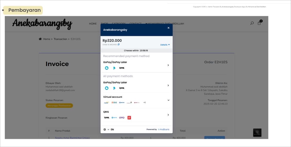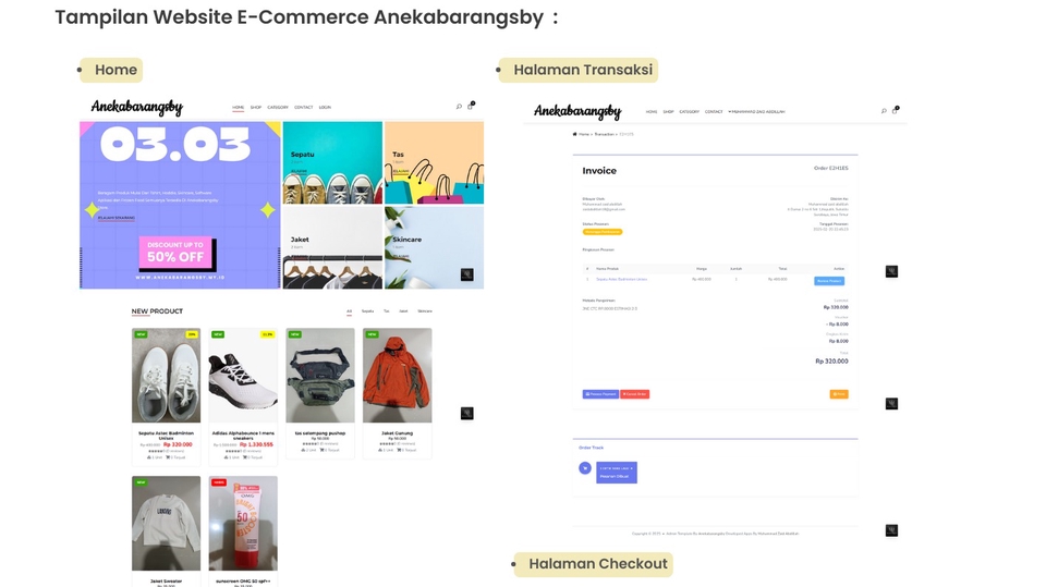 Saya menyediakan layanan pembuatan website e-commerce lengkap yang modern, cepat, dan aman dirancang khusus untuk membantu bisnis Anda menjual produk secara online dengan mudah dan profesional. Website yang saya bangun mencakup fitur-fitur penting seperti: ✅ 1. Tampilan Beranda yang Menarik & Responsif Desain visual yang modern, rapi, dan mobile-friendly seperti pada contoh halaman depan “AnekaBarangSby”. • Banner promo • Kategori produk • Produk terbaru • Highlight diskon atau event tertentu ✅ 2. Sistem Katalog Produk Lengkap • Listing produk dengan harga, stok, dan label promo • Detail produk jelas dan mudah dibaca • Fitur filter & kategori agar pembeli cepat menemukan produk ✅ 3. Halaman Checkout yang User-Friendly Checkout dirancang sederhana dan cepat, mencakup: • Input alamat lengkap • Pilihan ekspedisi (JNE, dll) • Voucher / kode promo • Hitungan total otomatis (subtotal, ongkir, potongan) ✅ 4. Integrasi Pembayaran Otomatis (Midtrans) Pembeli bisa memilih berbagai metode pembayaran: • GoPay / GoPay Later • Transfer Virtual Account (BCA, BNI, Mandiri, dll) • QRIS berbagai e-wallet • Pembayaran realtime tanpa perlu konfirmasi manual Semua pembayaran akan masuk ke dashboard Midtrans dan otomatis memperbarui status pesanan di website. ✅ 5. Dashboard Admin Lengkap • Kelola produk • Kelola pesanan & status pengiriman • Kelola voucher • Laporan penjualan ✅ 6. Keamanan Terjamin & Website Cepat • SSL / HTTPS • Sistem login aman • Optimasi kecepatan halaman ✅ 7. Fitur Tambahan -Memiliki Fitur Chat -Memiliki Fitur Pengembalian barang -Wishlist Produk -Testimoni Produk