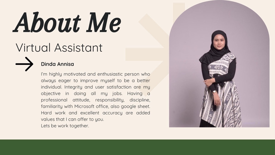 I’m highly motivated and enthusiastic person who always eager to improve myself to be a better individual. Integrity and user satisfaction are my objective in doing all my jobs. Having a professional attitude, responsibility, discipline, familiarity with microsoft office, also google sheet. Hard work and excellent accuracy are added values that I can offer to be able to contribute to your company.