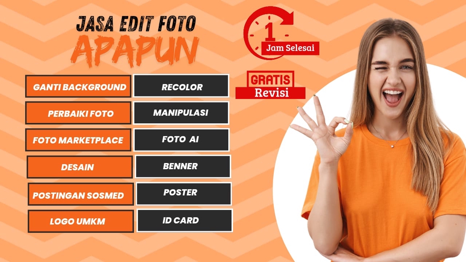 Rp50,0 rb- 1 file gambar/photo - Mendapat file JPEG, PNG, dan PDF (jika diperlukan) - 1 jam pengerjaan selesai - Gratis revisi hingga deal Harga bisa lebih murah tergantung tingkat kesulitan