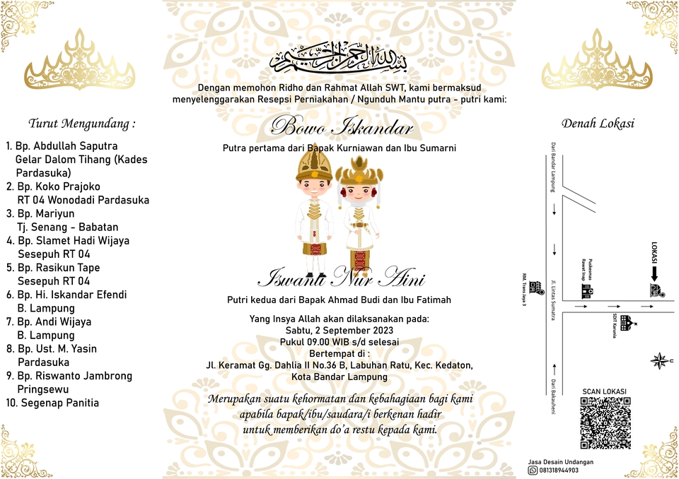 Undangan pernikahan yang menarik untuk anda, bisa custom sesuai dengan selera dengan proses pengerjaan yang cepat, dan harga yang sangat terjangkau. Proses revisi disesuaikan dengan harga dan paket yang anda mau. Langkah Pekerjaan 1. Hubungi saya dan ceritakan undangan seperti apa yang anda inginkan 2. Berikan data diri anda dan pasangan berserta data-data pendukung lainnya 3. Saya akan buatkan 3 referensi undangan yang telah dibuat (jika anda memilih paket A) 4. Saya lakukan revisi sesuai paket yang anda pilih 5. Jika sudah fix, saya akan kirimkan file undangan dengan format pdf/jpg/png