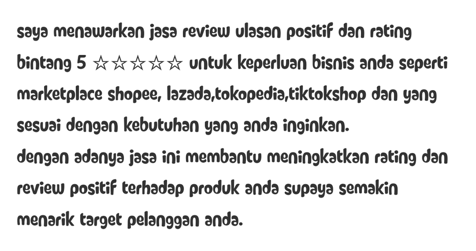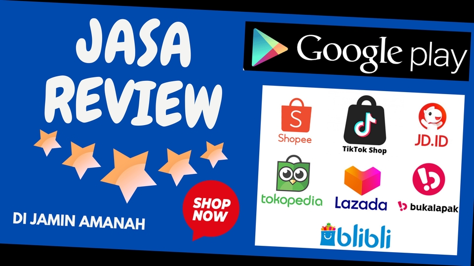 Saya menawarkan jasa review positif untuk meningkatkan toko anda Review bintang 5 Pakai akun asli bukan bot Penilaian positif dan alami bukan coppy paste SHOPEE TOKPED TIKTOKSHOP AKULAKU LAZADA GOOLE PLAYSTORE GOOGLE MAPS DLL (BISA REQUEST) Langkah Pekerjaan 1. 1. Order Produk Di Toko 2. Konfirmasi Total Harga Checkout 3. Membayar Orderan Oleh Penjual 4. Pengiriman Paket 5. Penerimaan Paket 6. Membuat Draft Ulas 7. Setujui / Revisi 8. Posting Ulang 2. 1. Diskusi Dengan Client 2. Order Produk Di Toko 3. Konfirmasi Total Harga Checkout 4. Membayar Orderan Oleh Penjual 5. Pengiriman Paket 6. Penerimaan Paket 7. Membuat Draft Ulas 8. Setujui / Revisi 9. Posting Ulasan