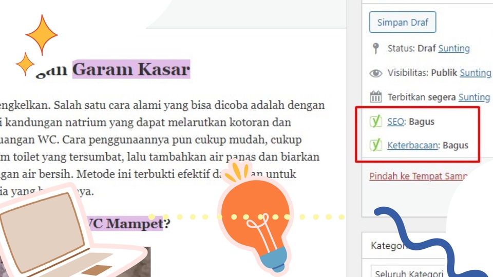 Butuh konten yang menarik dan SEO-friendly untuk website atau blog Anda? Kami menyediakan jasa penulis artikel SEO profesional yang siap membantu meningkatkan traffic dan ranking website Anda. Tim penulis kami terdiri dari ahli SEO dengan pengalaman yang luas dalam menulis artikel yang informatif, relevan, dan menarik bagi pembaca. Kami menggunakan teknik penulisan yang tepat untuk memastikan artikel kami memiliki keyword yang tepat, kalimat aktif, dan mudah dipahami. Dengan panjang penulisan 1000 kata dan tersusun sesuai kaedah SEO, kami menjamin artikel kami akan menghasilkan efek yang signifikan bagi website atau blog Anda. Percayakan kepada kami untuk meningkatkan visibilitas website atau blog Anda di mesin pencari dengan jasa penulis artikel SEO profesional kami. Langkah Pekerjaan 1. Pengumpulan Informasi: Penulis artikel akan meminta informasi terkait topik yang akan dibahas dan tujuan artikel tersebut. Informasi ini dapat berupa keyword yang ingin ditargetkan, target audiens, dan tujuan dari artikel. 2. Penelitian Kata Kunci: Setelah mendapatkan informasi terkait topik, penulis artikel akan melakukan penelitian kata kunci yang relevan dan sering dicari oleh pengguna di mesin pencari. 3. Menulis dan Optimalisasi Konten: Setelah kata kunci terpilih, penulis artikel akan mulai menulis konten yang relevan dengan topik dan target audiens. Konten akan dioptimalkan dengan menggunakan kata kunci yang terpilih secara alami di dalam artikel. 4. Pengeditan dan Peninjauan: Setelah selesai menulis, artikel akan diperiksa dan diedit untuk memastikan bahwa artikel bebas dari kesalahan ejaan, tata bahasa, dan gaya penulisan yang konsisten. Kemudian, artikel akan diperiksa untuk memastikan bahwa artikel memenuhi persyaratan SEO seperti kepadatan kata kunci yang sesuai. 5. Penyebaran dan Promosi: Setelah artikel selesai dan diperiksa, artikel akan dipromosikan melalui berbagai saluran seperti media sosial dan direktori artikel untuk meningkatkan visibilitas dan backlink ke situs Anda.