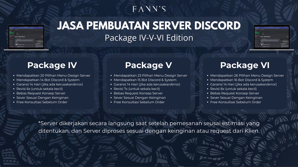 Fann's DC - Official Shop Hello! 👋🏻 Anda sedang membaca deskripsi ini. Apakah Anda ingin membuat server, namun merasa malas atau tidak mengerti caranya? Jangan khawatir, Fann's bisa membantu Anda! Anda hanya perlu menunggu server selesai dibuat sesuai dengan keinginan Anda. Untuk server, kami sesuaikan dengan permintaan masing-masing pembeli. Pembeli wajib mengisi form untuk menyusun menu yang ingin dimasukkan ke dalam server yang dibeli. Toko kami berbeda dari yang lain: lebih berkualitas, lebih menarik, bebas request, dengan pilihan menu yang beragam, dan masih banyak lagi. Proses pengerjaan hanya membutuhkan waktu beberapa jam saja, dengan estimasi sebagai berikut : - Proses tercepat: 1-2 jam - Waktu normal: 2-4 jam - Waktu paling lama: 1x24 jam INFORMASI 1 : Anda hanya perlu menunggu hingga server siap digunakan. Server sudah dilengkapi full setup tanpa biaya tambahan, dan dijamin aman (tanpa kebocoran). Setup bot juga sudah lengkap sesuai dengan produk yang Anda pesan. INFORMASI 2 : Anda dapat memilih untuk menggunakan server sendiri atau menggunakan server baru dari kami. Kedua pilihan tersebut tidak mempengaruhi harga. Anda tetap mendapatkan semua menu dan fitur tanpa potongan atau tambahan biaya. INFORMASI 3 : Server akan dilengkapi dengan event yang sudah dibuat sebelumnya. Anda hanya perlu mengubah nama-nama yang diperlukan. Juga, sudah disediakan saluran pengumuman (announcement channels). BEBAS REQUEST : Anda bisa request apa saja untuk server Anda. Misalnya, meniru server orang lain namun dengan tampilan yang berbeda, request channel, roles, dan lainnya. TIPE SERVER : - Komunitas Shop Servers - Komunitas Store Servers - Komunitas Sekolah Servers - Komunitas Kampus Servers - Komunitas Kerjaan Servers - Komunitas Games Servers - Komunitas Squad Servers - Komunitas Samp Servers - Komunitas Santai & Kumpul Servers - Komunitas Jual Beli - Komunitas Perusahaan - Komunitas Request KEUTAMAAN : - Bebas request - Proses cepat - Berkualitas - Berbeda dari yang lain - Pilihan menu sesuka hati - Server sesuai dengan keinginan - Dan lain-lain KEUNTUNGAN : - Tidak ada batas maksimal create channels - Tidak ada batas maksimal create kategori - Tidak ada batas maksimal create voice - Tidak ada batas maksimal create roles KETERANGAN : - Buka: 15:00 WIB - Tutup: 00:00 WIB - Buka setiap hari - Jam istirahat: 18:00 WIB - 18:30 WIB PRODUK : - Kualitas lV - V - Vl - Memiliki 25 Hingga 35 Pilihan Menu - Unlock Semua Keuntungan & Keutamaan - Bebas Request - Mendapatkan Bonus 14 Hingga 17 Bots - Proses 2-3Jam / 1×24jam - Harga 160.000-180.000-190.000 (Untuk produk yang lebih berkualitas dan beragam, bisa klik kunjungi toko kami ya, Kak!)