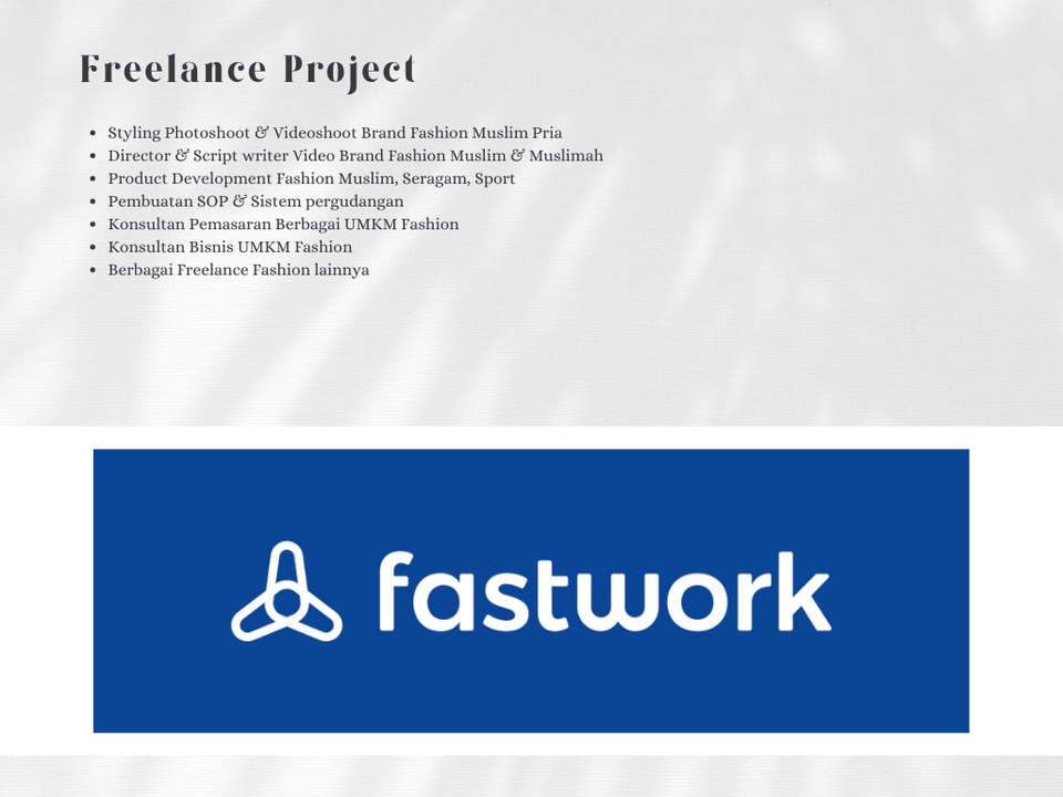 Kami berpengalaman lebih dari 8 tahun di Industri fashion dan memahami proseb bisnis fashion sejak pra produksi hingga after sales. kami ikut serta dalam membangun dan mengembangkan berbagai bisnis fashion khususnya pakaian. dengan pengalaman tersebut kami akan membantu anda dalam membangun bisnis sejak perencanaan hingga launching yang akan kami rangkum dalam bebagai dokumen seperti : 1. Business Canvas 2. Business Plan 3. Production Plan 4. Budgeting 5. Marketing Strategy 6. dan file lainnya sesuai kebutuhan anda Langkah Pekerjaan 1. Order Dibuat 2. Penawaran, Faktur 3. Pembayaran 4. Bekerja 5. Tinjauan 6. Selesai