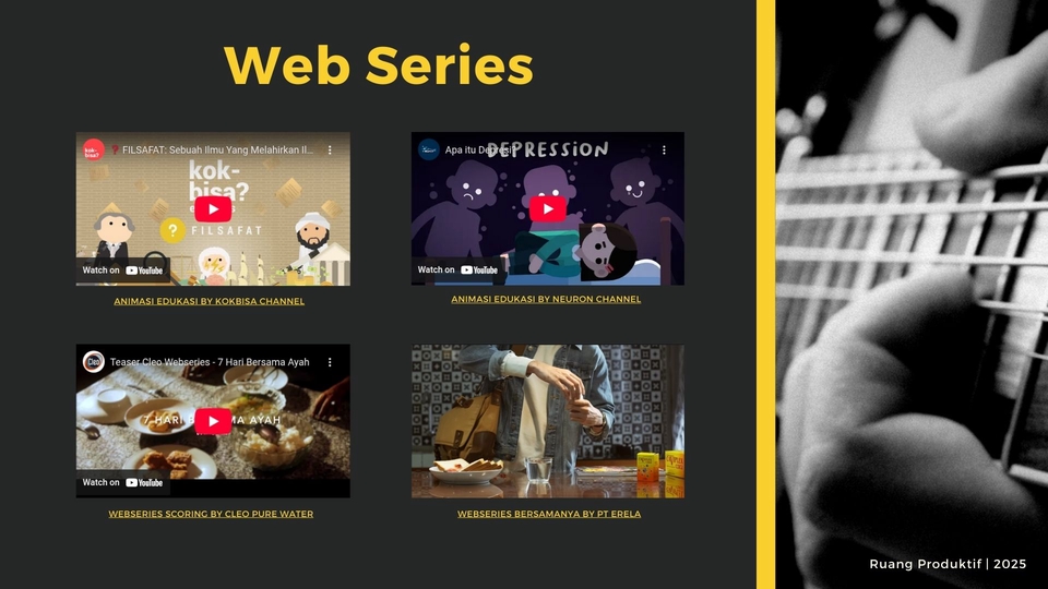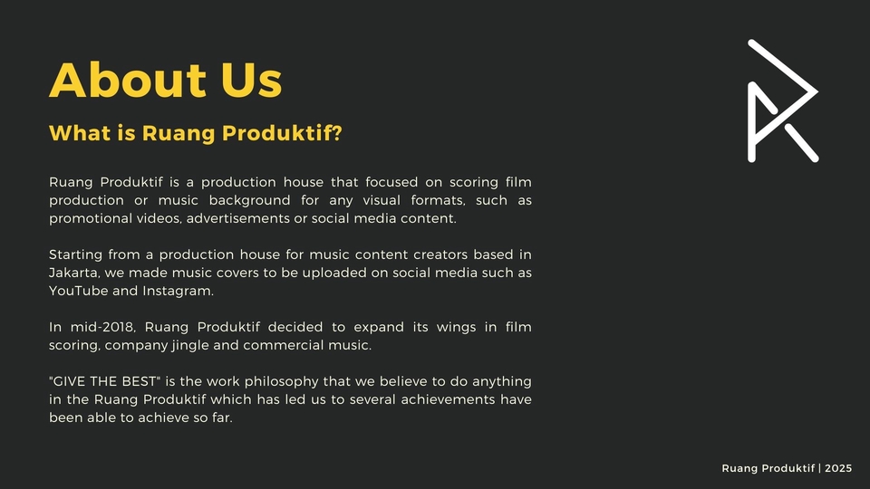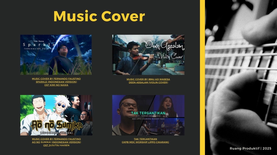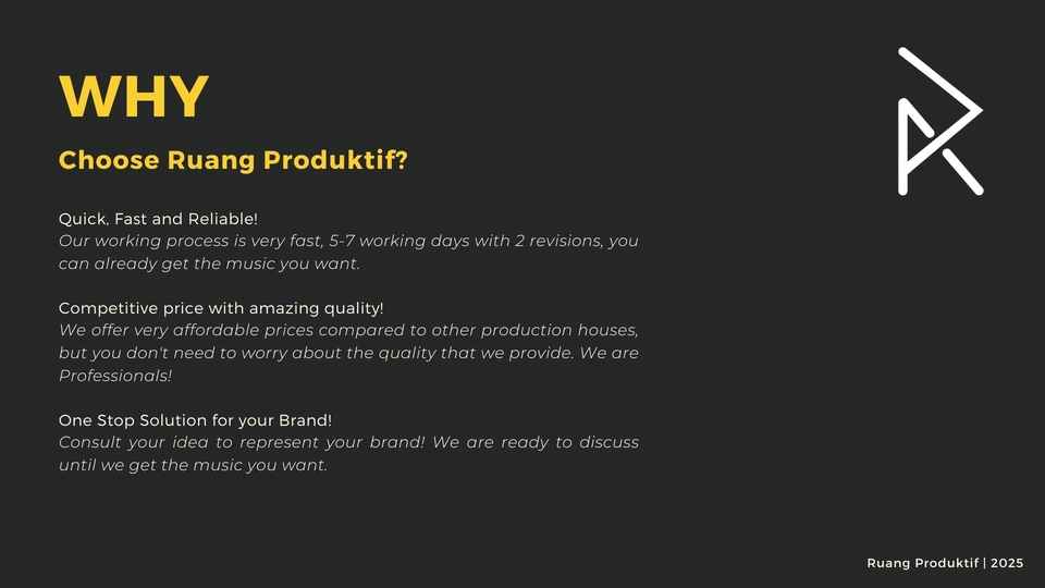 Perkenalkan kami Ruang Produktif, Kami adalah Rumah Produksi yang berfokus ke Musik dan Audio production! Service yang kami sediakan berupa: 1. Film Scoring (Short/Feature Film) 2. Background Music (TVC/Digital Ads/Company Profile) 3. Songwriting (Jingle/Original Songs) 4. Arrangment (Backing Track/Minus One/Karaoke) 5. Audio Mixing & Mastering (Editing/Cleaning/Mix) 6. Sound Design (SFX/Foley) Jangan ragu untuk Chat terlebih dahulu untuk berdiskusi dan Negosiasi!!! Langkah Pekerjaan 1. Pilih Paket yang anda inginkan dan pastikan sesuai dengan kebutuhan anda. 2. Chat kami untuk memberitahuakn brief sesuai paket yang anda pilih. Diskusikan semuanya kepada kami seperti Referensi dan Konsep yang anda inginkan. 3. Setelah mendapatkan brief, kami akan segera mengerjakan pesanan sesuai dengan brief yang telah diberikan dengan estimasi pengerjaan yang tertera di paket yang telah dipilih. (tidak termasuk sabtu, minggu, dan libur nasional) 4. Setelah pengerjaan, kami akan memberikan file preview. Jika ada yang perlu di Revisi, tolong berikan penjelasan bagian mana saja yang perlu di revisi. (perhatikan jumlah revisi yang tertera disetiap paket) 5. Setelah semuanya OK, kami akan mengirimkan file master dengan format .wav dan .mp3