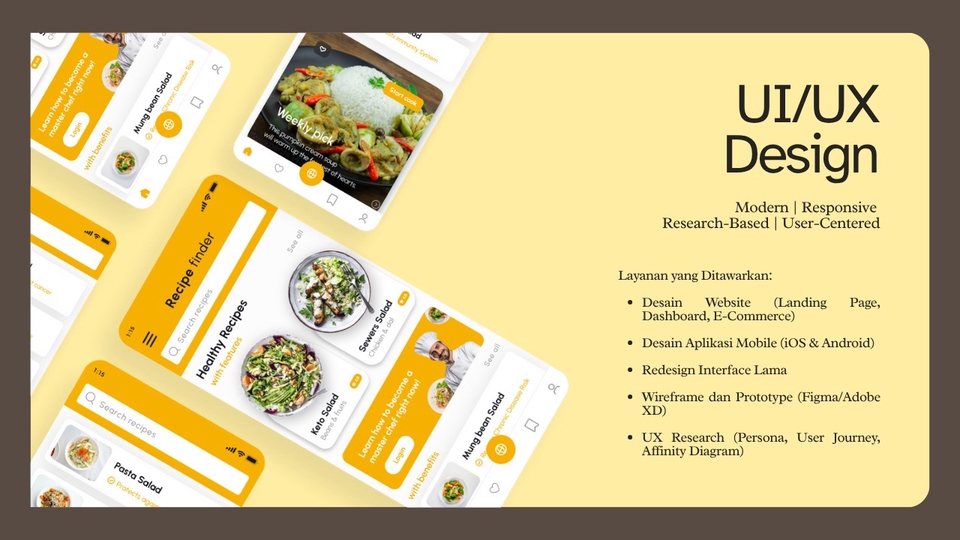 Saya akan membantu Anda membuat desain UI/UX profesional yang tidak hanya indah secara visual, tetapi juga berfokus pada pengalaman pengguna (user experience). Setiap proyek saya mulai dengan riset pengguna, lalu diterjemahkan menjadi desain antarmuka yang intuitif dan mudah digunakan.