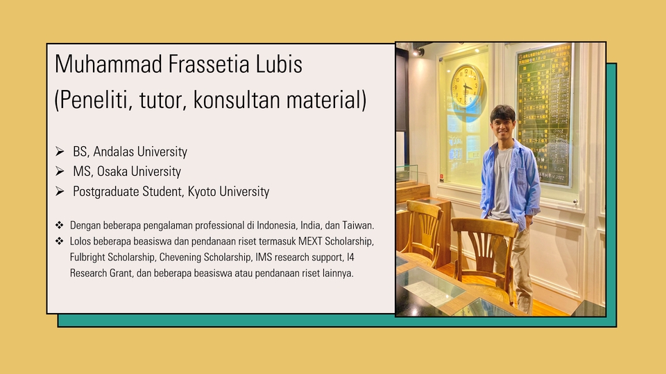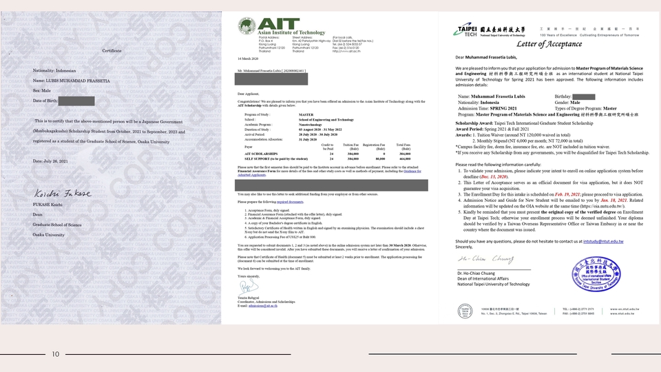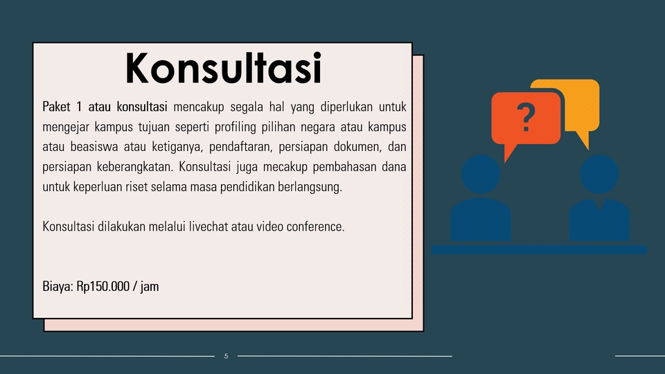 Berpengalaman menerima lebih dari 15 beasiswa dalam dan luar negeri yang berbeda di Indonesia, Jepang, Taiwan, Qatar, dan Korea Selatan. Scholarship hunter dalam rentang waktu 10 tahun terakhir. Di sini kami akan memberikan konsultasi tahapan dalam mendaftar beasiswa, dan cara mendapatkan LOA kampus, apa saja yang perlu dipersiapkan dalam seleksi beasiswa, konsultasi esai beasiswa, latihan persiapan wawancara beasiswa atau admission universitas, dan pembuatan timeline persiapan studi lanjut di universitas tujuan dengan beasiswa tujuan. Kami juga bersedia sharing tentang kehidupan perkuliahan khususnya di seputar beberapa negara Asia. Pada prinsipnya boleh tanya apa saja seputar beasiswa luar negeri, daftar kampus luar negeri, dan perkuliahan di luar negeri. Langkah Pekerjaan 1. Calon klien menghubungi 2. Diskusi kebutuhan klien dan kesepakatan waktu penyelesaian layanan 3. Pembayaran 4. Konsultan mengirim link untuk beberapa paket (Konsultasi, Review Surat Rekomendasi, dan Latihan Wawancara) 5. Klien mengirim file esai (paket Koreksi Esai)