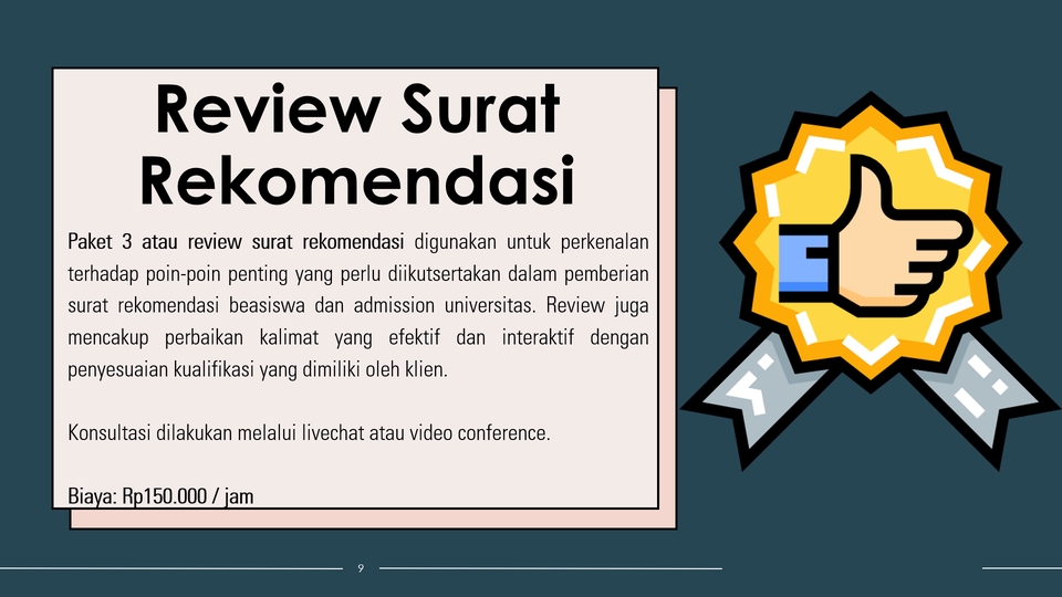Rp150,0 rbKonsultasi dan review surat rekomendasi: - Dilakukan melalui livechat atau video conference selama 1 jam. L:atihan wawancara:. - Latihan wawancara dilakukan melalui video conference selama 1 jam.