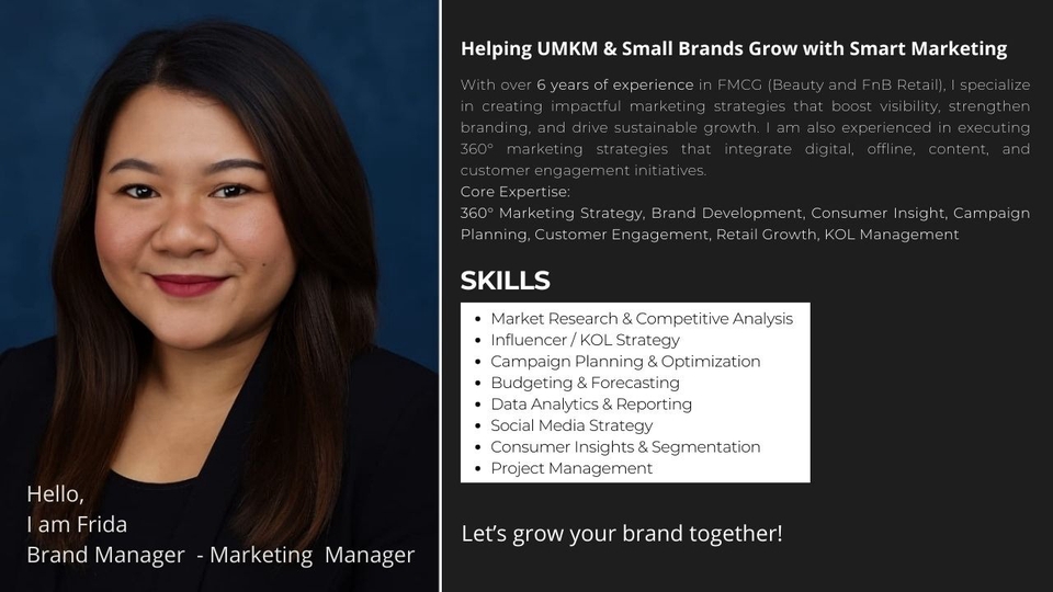 Marketing Consultant with 6+ years in FMCG (Beauty & FnB Retail). Skilled in 360° marketing, brand growth, KOL, Market Research, and consumer insight. Led campaigns with 50M+ views and ROI up to 53x, driving strong GMV results. I believe marketing is about building meaningful customer connections and lasting brand value.