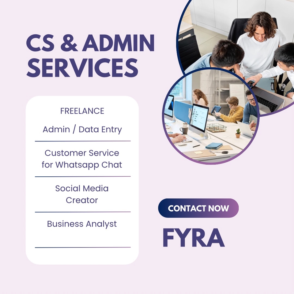 Halo, saya Fyra 👋 Saya menawarkan jasa sebagai Customer Service dan Admin Chat Online : Membalas chat pelanggan dengan ramah dan sopan Menjawab pertanyaan produk sesuai script yang diberikan Mencatat pesanan ke Google Sheets agar rapi Update status pesanan & follow up pelanggan Waktu kerja: Fleksibel (sore/malam atau sesuai kesepakatan) Respon cepat (≤10 menit saat online) Harga Jasa: Rp 75.000 / hari (3–4 jam kerja) Rp 300.000 / minggu (paket hemat) Keunggulan saya: ✅ Ramah & komunikatif ✅ Memiliki Kemampuan Public Speaking ✅ Memiliki Background Marketing Semoga bisa bekerja sama, terima kasih !