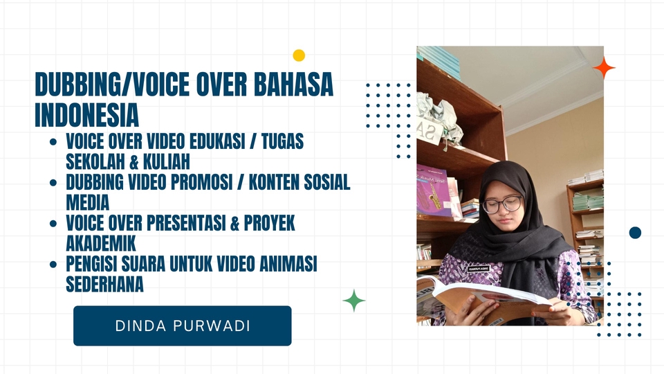 Dubbing & Voice Over Bahasa Indonesia – Pengisi Suara Video Tugas, Konten & Promosi 🎧 Layanan yang tersedia: 🎬 Voice Over Video Edukasi / Tugas Sekolah & Kuliah Narasi suara jelas, natural, dan sesuai intonasi materi. Cocok untuk presentasi, tugas video, atau project multimedia. 📢 Dubbing Video Promosi / Konten Sosial Media Suara menggantikan karakter atau narasi dalam video (dubbing ringan), cocok untuk konten promosi UMKM, edukasi, atau kampanye singkat. 🎓 Voice Over Presentasi & Proyek Akademik Membacakan materi slide atau naskah akademik agar lebih menarik dan komunikatif. 🗣️ Pengisi Suara untuk Video Animasi Sederhana Cocok untuk tugas kreatif, storytelling, atau video anak-anak. 🎙️ Fitur layanan: Suara jernih, intonasi disesuaikan File dikirim format MP3/MP4 Bisa request gaya suara: serius, ceria, formal, dll Durasi maksimal 1–3 menit (bisa custom) 📌 Cocok untuk: Tugas pelajar/mahasiswa, konten edukatif, promosi digital, presentasi video, dan video sosial media.
