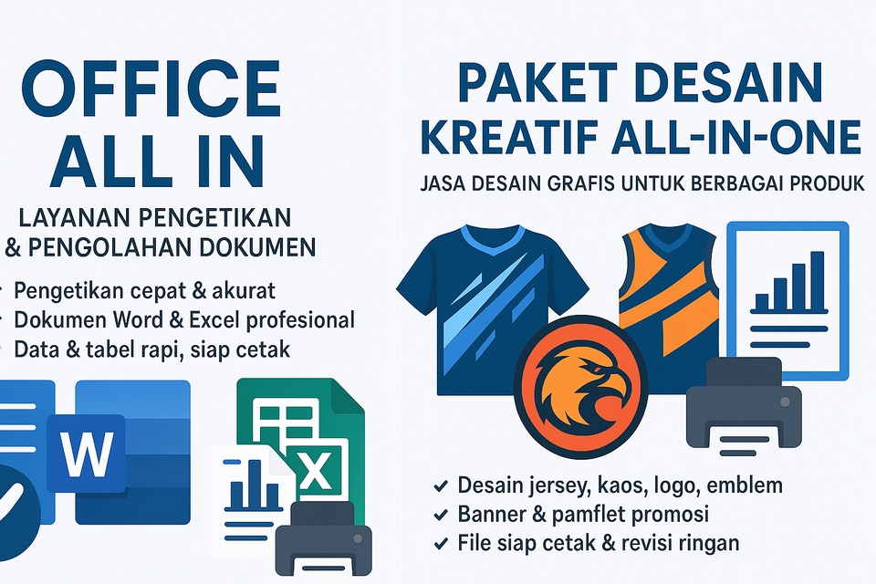 Kreator desain grafis profesional untuk baju, jersey, ornamen, banner, dan pamflet. Desain custom, unik, dan detail via CorelDRAW. Tampilkan identitas dan gaya Anda dengan karya visual yang memukau! Langkah Pekerjaan 1. Terima Permintaan Klien Klien mengirim detail kebutuhan (jenis file, format, contoh, referensi, dll). 2. Diskusi Awal & Konsultasi Gratis Klarifikasi kebutuhan, konsep desain (jika desain), atau format dokumen (jika pengetikan/Excel). 3. Penawaran & Estimasi Waktu Kirim estimasi harga dan lama pengerjaan sesuai kompleksitas. 4. Persetujuan & Pembayaran Awal Klien menyetujui dan melakukan pembayaran (DP atau lunas, sesuai kesepakatan). 5. Pengerjaan Tahap Awal Mulai proses pengetikan, pembuatan desain, atau pengolahan data. 6. Preview Awal Dikirim ke Klien Kirim hasil sementara (screenshot atau PDF) untuk dicek klien. 7. Revisi (Jika Diperlukan) Lakukan revisi ringan sesuai feedback (maks. 2–3 kali sesuai paket). 8. Finalisasi File Koreksi terakhir & persiapan file akhir (Word, Excel, CDR, PDF, PNG, dsb). 9. Pengiriman File Final Kirim file final melalui email, chat, atau link drive. 10. Testimoni & Layanan Tambahan Minta ulasan/tanggapan klien, tawarkan layanan lanjutan jika diperlukan.