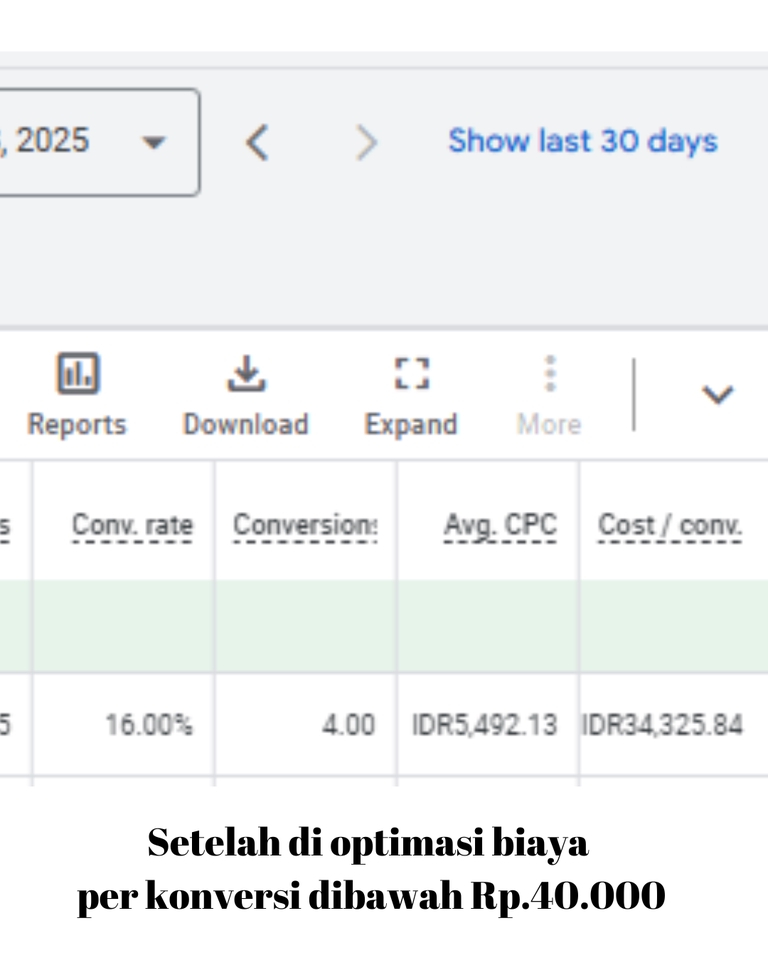 Apakah iklan Google Ads Anda terasa boros dan tidak memberikan hasil yang maksimal? Saya siap membantu Anda mengevaluasi dashboard Google Ads untuk menemukan penyebab kebocoran budget, mengidentifikasi faktor yang membuat cost per conversion tinggi, serta merancang strategi agar leads yang masuk lebih banyak dengan biaya lebih efisien. Dengan pengalaman bertahun-tahun dalam optimasi iklan, saya akan menganalisis data kampanye, struktur akun, pemilihan keyword, strategi bidding, hingga performa landing page. Saya juga akan memberikan insight actionable yang bisa langsung diterapkan agar iklan Anda lebih efektif dan profitabel. Jangan biarkan budget terbuang sia-sia! Dapatkan analisis mendalam dan strategi terbaik untuk meningkatkan ROI iklan Anda. Langkah Pekerjaan 1. client menjelaskan permasalahan yang dialami 2. client memberikan data-data yang diminta untuk bahan analisa 3. observasi data dan pembuatan report 4. pemaparan report