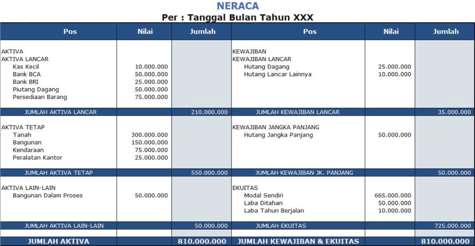 Jasa akuntansi pembuatan laporan keuangan lengkap mulai dari Laba Rugi, Neraca, Arus Kas, Pembelian, Penjualan, Persediaan, Hutang, Piutang, analisa laporan keuangan beserta rasio pendukungnya. Langkah Pekerjaan 1. Penerimaan data dalam format Ms. Excel atau sejenis 2. Proses jurnal akuntansi 3. Pembuatan laporan keuangan