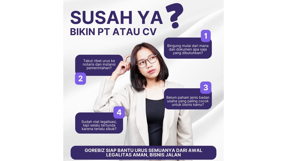 Gorebiz Official membantu pelaku usaha mengurus legalitas bisnis seperti pendirian PT, CV, izin usaha, hingga konsultasi pajak dan keuangan. Kami juga menyediakan layanan virtual office dan working space strategis. Dengan proses cepat, transparan, dan profesional, Gorebiz siap jadi solusi terpercaya agar bisnis Anda tumbuh legal dan berpondasi kuat.