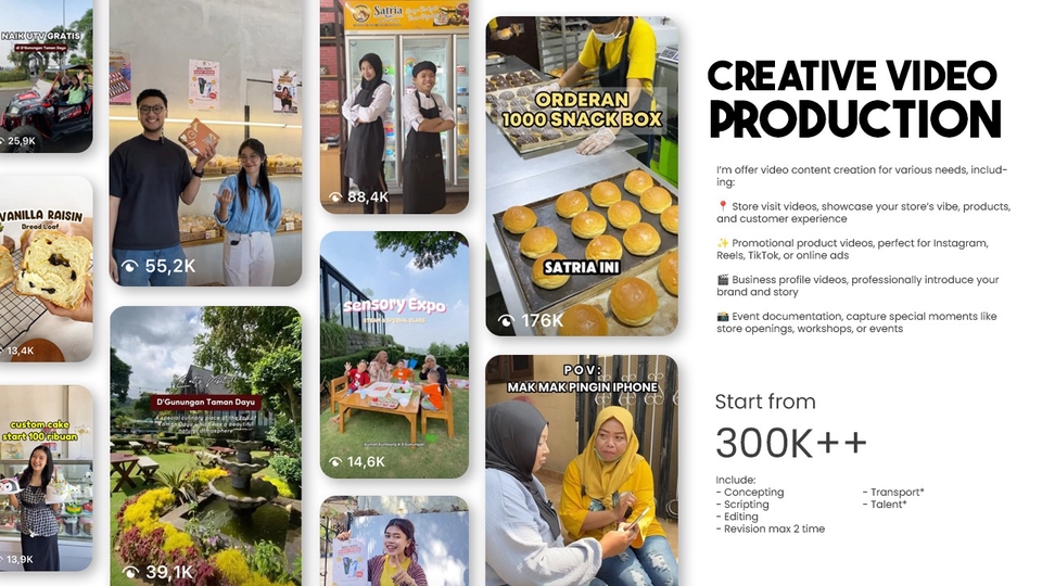Butuh video yang bisa bikin bisnismu makin dikenal dan terlihat profesional? aku siap bantu! aku menyediakan layanan pembuatan video kreatif untuk berbagai kebutuhan, seperti: 📍 Video visit toko — tampilkan suasana toko & keunggulan layananmu secara visual ✨ Konten promosi produk — cocok untuk feed Instagram, reels, TikTok, atau ads 🎬 Video profil usaha — memperkenalkan bisnismu secara profesional & menarik 📸 Dokumentasi acara — abadikan momen penting seperti soft opening, workshop, atau event spesial lainnya Setiap video dikemas dengan konsep yang disesuaikan dengan brand kamu, dikombinasikan dengan visual menarik & storytelling yang engaging. 📩 Hubungi aku dan mulai bikin konten yang bisa bikin audiens jatuh hati ❤️