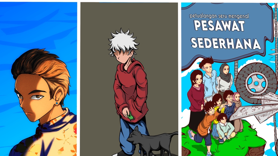 Menawarkan ilustrasi simple atau hard work -karakter full body/ ½body (+backround) -karikatur/cartoon -pemandangan -ilustrasi produk -atau yang lainnya Format PNG,JPNG berbasis vector atau pixel sesuai kebutuhan Cocok untuk moskot,cover sampul, stiker,atau kebutuhan blog pribadi Langkah Pekerjaan 1. Penentuan tema gambar 2. Sketsa 3. Revisi 4. Vector jika ingin 5. Pewarnaan 6. Revisi warna atau detail 7. Diskusi hasil 8. Result