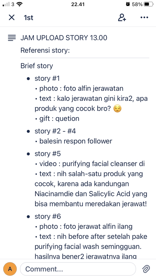Saya berpengalaman selama 3 tahun lebih dalam membuat brief/script konten untuk media sosial, seperti instagram, tiktok, dan youtube. Beberapa akun brand yang sudah pernah saya pegang sebelumnya diantaranya; @elvicto.id, @_unlabel, @riderkids_underwear, @indobarbersupply, dan @gammaplusid_barber. Langkah Pekerjaan 1. Jelaskan kebutuhan kepada freelancer 2. Menunggu freelancer untuk membuat penawaran kerja 3. Tinjau dan setujui penawaran kerja 4. Pembayaran dengan mudah melalui semua saluran pembayaran. Kartu kredit, transfer bank, e-walet dan ritel outlet 5. Freelance mengirim hasil akhir melalui platform 6. Tinjau dan setujui hasil pekerjaan akhir