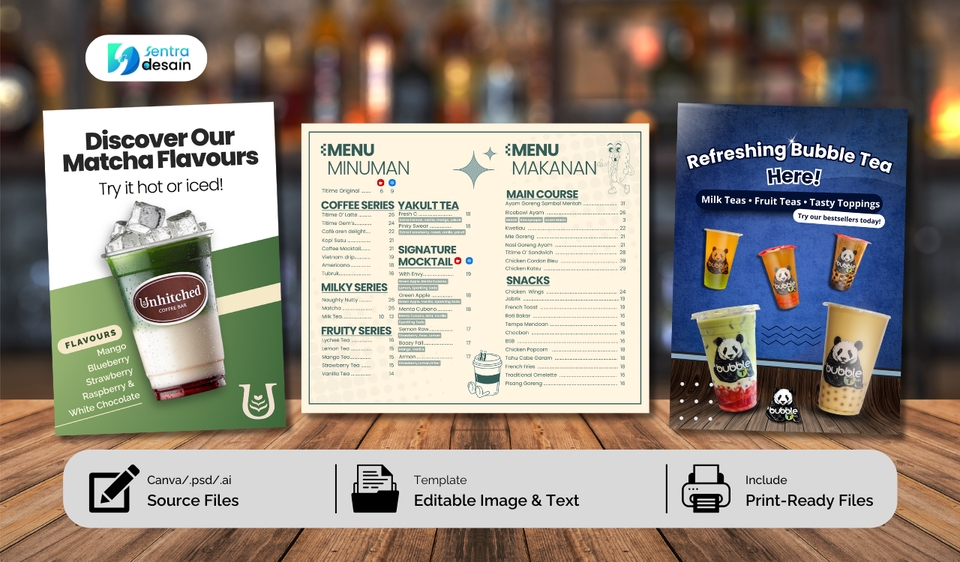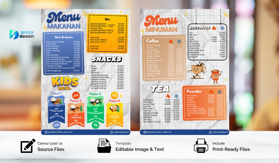 Klien perlu menyiapkan hal berikut : 1. Logo ( Jika ada ) 2. Materi dan Daftar harga yang ingin dimasukkan kedalam menu 3. Foto makanan dan minuman ( Bisa kami yang sediakan ) 4. Referensi Desain Keuntungan yang didapatkan jika menggunakan jasa kami : 1) Membangun kepercayaan Customer 2) Hemat waktu dan Efektif 3) Semakin Professional 4) Bisnis Berkembang 5) Meningkatkan Loyalitas Pelanggan Langkah Pekerjaan 1. Briefing Konsep Desain 2. Buyer Mengirim Bahan Materi (Logo / Foto/Menu/Keterangan Lain) Jika Ada