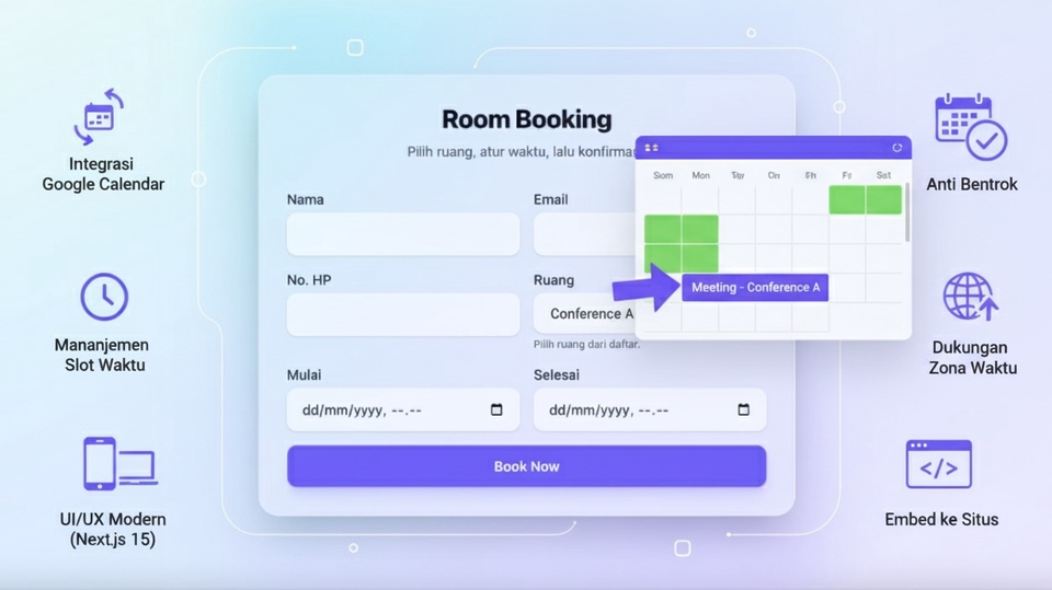 Website Booking Room/ Ruangan adalah solusi penjadwalan yang terintegrasi langsung dengan Google Calendar. Pengguna dapat memilih slot waktu yang tersedia, sistem otomatis memblok jadwal di kalender, serta menghindari bentrokan. Dukungan zona waktu, tampilan modern, dan integrasi yang aman membuat proses booking cepat, jelas, dan profesional. Fitur Utama Integrasi Google Calendar: Sinkron dua arah untuk membaca ketersediaan dan memblokir jadwal secara otomatis. Manajemen Slot Waktu: - Tentukan durasi, buffer, dan jam operasional per hari. Anti Bentrok: - Cek ketersediaan real‑time agar janji tidak tumpang tindih. Dukungan Zona Waktu: - Otomatis menyesuaikan dengan lokasi pengunjung. UI/UX Modern: - Dibangun dengan Next.js 15, cepat, responsif, dan mudah dipakai. Konfigurasi Mudah: - Gunakan Service Account Google untuk akses kalender secara aman. Embed ke Situs: - Tempelkan widget booking ke halaman yang sudah ada. Keunggulan Cepat dipasang: Arsitektur sederhana, konfigurasi singkat. Aman: Kredensial disimpan di server, akses terkontrol via Service Account. Skalabel: Cocok untuk individu hingga tim kecil/menengah. Fleksibel: Mudah dikembangkan fitur tambahan sesuai kebutuhan. Website siap digunakan