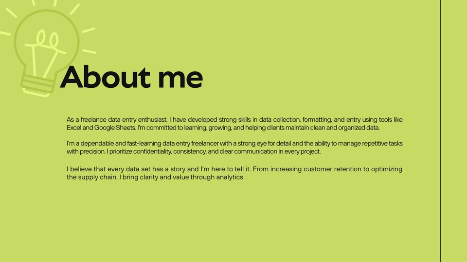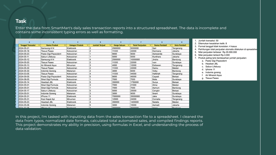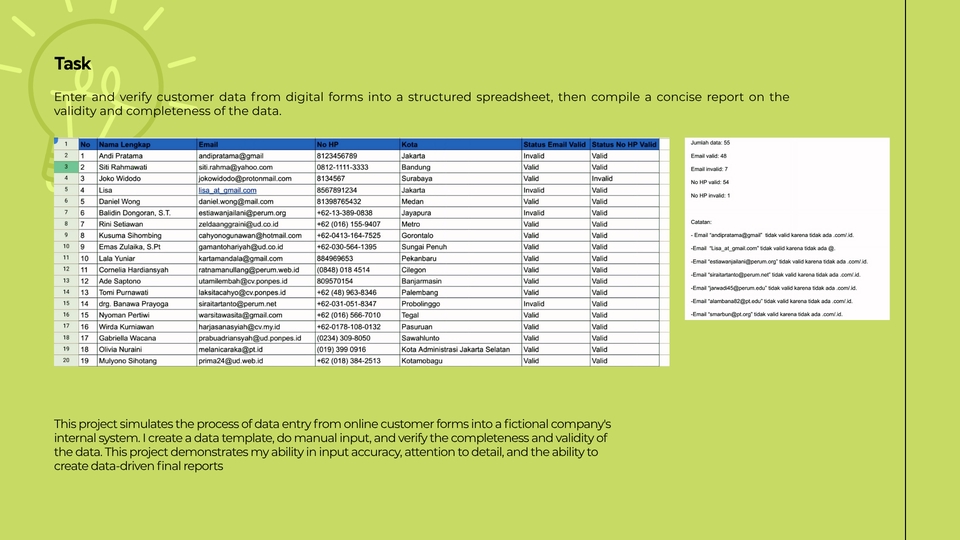 Saya adalah freelancer data entry yang memiliki kemampuan mengetik dengan baik, dan teliti.Saya terbiasa bekerja mengunakan aplikasi micrososft excel, google spread sheet dan beberapa aplikasi lainnya siap membantu Anda dalam menangani berbagai pekerjaan administratif dan pengolahan data. Layanan yang saya tawarkan meliputi: • Entri data ke dalam Microsoft Excel, Google Sheets, atau sistem lainnya • Pemrosesan dan pembersihan data • Konversi file (PDF ke Word/Excel, dll.) • Konversi data ( Foto ke Excel / word ,dll. ) • Web scraping dan web research atau data collection manual • Copy-paste data dari berbagai sumber Saya selalu memastikan hasil kerja yang rapi, akurat, dan selesai tepat waktu. Komunikasi yang baik adalah prioritas saya agar setiap proyek bisa berjalan lancar sesuai harapan Anda. Langkah pekerjaan : 1. Kirim pesan berisi penjelasan terkait detail pekerjaan yang diminta klien, termasuk jenis file, deadline, instruksi tambahan jika ada dan juga penawaran harga. 2. Setelah klien memberikan / mengirimkan file, freelancer akan melakukan pekerjaan. 3. Freelancer mengirimkan laporan hasil pekerjaan yang sudah diselesaikan, jika ada kesalahan format atau kekurangan data ( atau data yang tidak sesuai ), klien bisa mengajukan revisi dan freelancer akan memperbaiki sampai sesuai yang di harapkan oleh klien. 4. Penyerahan proyek ke klien sesuai yang di minta dan diharapkan oleh klien.