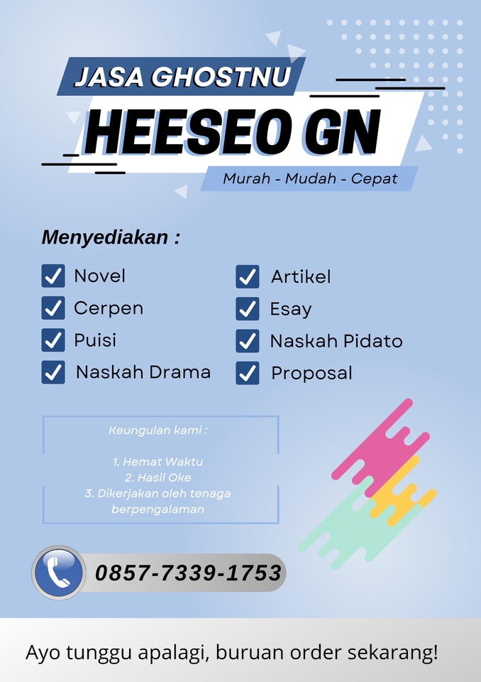 Hai, kami membuka jasa menulis, mencetak novel ( free cover ) dan mengoreksi novel. Jasa yang kami buka dalam menulis : 1. Novel 2. Cerpen 3. Puisi 4. Naskah Drama 5. Prosa 6. Pantun 7. Syair 8. Artikel 9. Esay 10. Naskah Pidato 11. Proposal kami nantikan orderan anda!