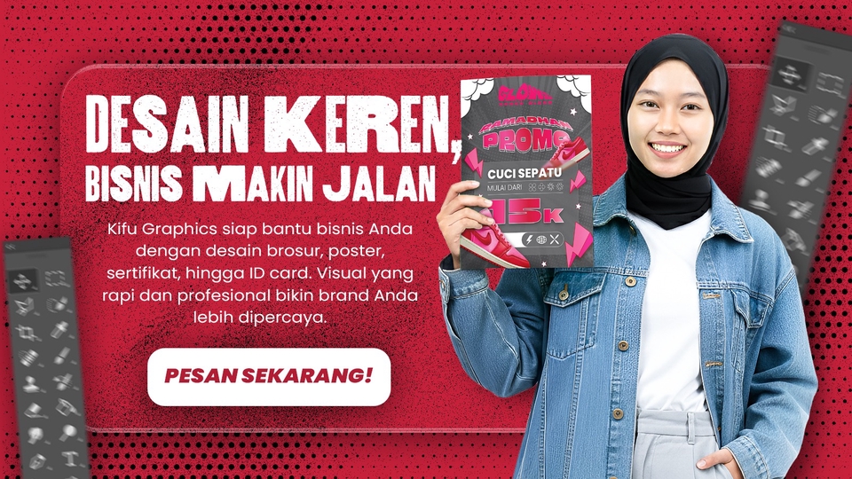 Butuh Desain untuk Menghidupkan Bisnis Anda? Kifu Graphics hadir untuk membantu usaha Anda tampil lebih profesional dan dipercaya. Kami menyediakan layanan desain digital printing seperti brosur, poster, pamflet, sertifikat, hingga ID card dengan hasil yang rapi dan sesuai kebutuhan Anda. Dengan pengalaman lebih dari 8 tahun di bidang desain, kami paham bahwa visual yang tepat bisa membuat bisnis Anda lebih menonjol dan mudah diingat. Setiap desain yang kami buat selalu mengutamakan kerapian, kejelasan pesan, dan tampilan yang menarik agar langsung memberi kesan positif bagi audiens Anda. Mengapa memilih Kifu Graphics? - Desain custom sesuai kebutuhan bisnis Anda - Komunikasi cepat dan mudah - Revisi fleksibel hingga hasil sesuai harapan - Harga terjangkau dengan kualitas maksimal Percayakan kebutuhan desain Anda pada Kifu Graphics dan biarkan visual yang kuat membawa usaha Anda ke level berikutnya.