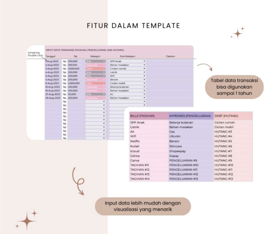 Monthly Budgeting ini digunakan untuk memudahkan perencanaan anggaran bulanan. Template ini berupa file Google Sheet yang memiliki palet warna pastel untuk membuat penganggaran sedikit lebih menyenangkan! Monthly Budgeting Pink-Purple Series : 1. Kategori : bisa dibreakdown menjadi 25 subkategori 2. Input Transaksi : pengisian data transaksi tagihan, pengeluaran, dan hutang beserta subkategorinya 3. Dashboard Budget Bulanan : bisa ganti bulan dan tahun sampai seterusnya Harap dicatat : template ini lebih cocok untuk yang memiliki pemasukan bulanan Keuntungan yang kamu dapatkan : ✔ Hitungan otomatis ✔ Simple dan mudah digunakan ✔ Visual grafik menarik ✔ Persentase progress ✔ Bisa digunakan di Handphone, Tablet, dan Laptop ✔ Ilustrasi kucing yang bisa berubah sesuai progress Untuk bisa mengakses template ini Anda membutuhkan akun email dari Gmail. Lalu kemudian template bisa diakses melalui device apapun (handphone, tablet, laptop) yang Anda miliki asalkan terdapat aplikasi browser di dalamnya seperti Chrome, Safari, dsb. Tersedia instruksi yang mudah digunakan untuk membantu Anda memulai mengisinya. BELI SEKALI, PAKAI SELAMANYA! Langkah Pekerjaan 1. Selesai payment anda, kami akan segera mengirimkan link ke email anda secepatnya 2. Jika ada pertanyaan kami akan segera menjawab pertanyaan tersebut