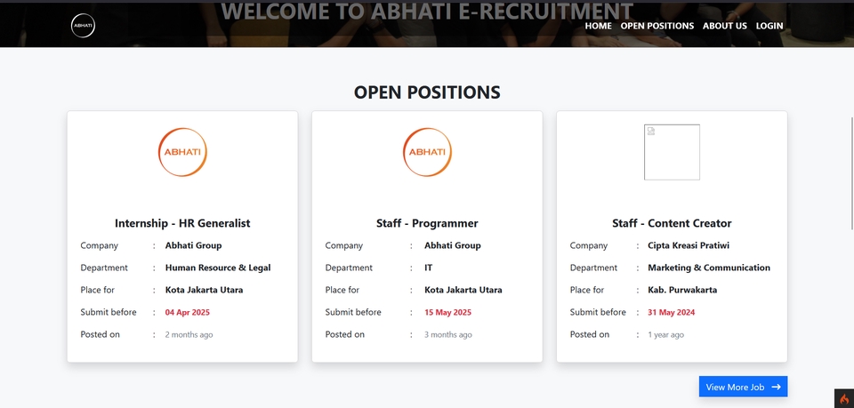 Ini adalah produk web development menggunakan codeigniter 4 yang saya bangun di Perusahaan Abhati Group. Program ini bertujuan untuk seluruh pelamar melihat pekerjaan yang ada di Perusahaan Abhati Group Langkah Pekerjaan 1. Meeting untuk mengumpulkan keperluan (analisis seluruh work flow program yang diinginkan, data-data sample dan lainnya) 2. Memberikan contoh tampilan program 3. Mulai pengerjaan 4. Meeting ke-2 untuk report progress serta User Acceptance Test (UAT) 5. Testing dan debugging 6. Selesai