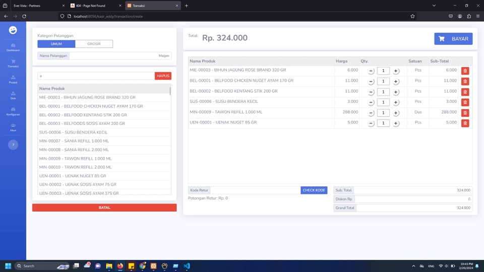 Rp40,0 jt1. Pemrosesan Transaksi - Menangani berbagai metode pembayaran, seperti tunai, kartu kredit/debit, dompet digital, atau transfer. - Menghitung total pembelian dan memberikan bukti pembayaran. 2. Manajemen Inventaris - Melacak stok barang secara otomatis setiap kali ada penjualan. - Memberikan peringatan untuk stok rendah dan membantu perencanaan pembelian ulang.