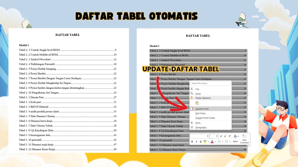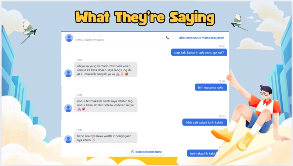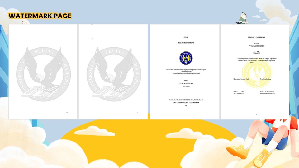 Butuh bantuan menyesuaikan format skripsi atau tugas akhir sesuai panduan kampus? Kami menyediakan jasa edit format profesional untuk skripsi, tugas akhir, dan dokumen lainnya. Keunggulan kami: 💡Teliti dan memperhatikan detail setiap halaman 💡Berpengalaman dalam format penulisan akademik 💡Pengerjaan tepat waktu dan sesuai panduan yang diminta Berikut List Perbaikan yang didapat SETIAP PAKET 📝Penyesuaian format judul, subjudul, dan paragraf (Memakai Heading Otomatis) 📝Nomor Halaman 📝Daftar Isi 📝Daftar Tabel 📝Daftar Gambar 📝Daftar Lampiran 📝Font Size 📝Type Font 📝Penyesuaian Spasi 📝Penyesuaian Alinea 📝Penyesuaian Margin 📄 Sistem Maksimal Pages—Pendekatan Menyeluruh untuk Dokumen Anda Dalam layanan editing ini, saya tidak menghitung biaya berdasarkan lembar. Saya menggunakan sistem maksimal pages—yakni pendekatan di mana setiap halaman dalam dokumen Anda akan dicek secara menyeluruh, mulai dari halaman pertama hingga terakhir. Bukan sekadar mengoreksi permukaan, tapi memahami keseluruhan struktur, konsistensi, format tulisan Anda. ✨ Mengapa Sistem Ini Unggul? 🔍 Pemeriksaan Utuh: Tidak ada halaman yang terlewat, tidak ada detail yang diabaikan. 🧠 Konsistensi & Struktur: Cocok untuk dokumen modular, akademik, atau profesional yang butuh keselarasan nomor, gaya, dan format. 🎯 Fleksibel & Efisien: Anda tidak perlu menghitung jumlah lembar atau khawatir soal halaman penuh/ganda. Fokus saya adalah kualitas. 💬 Transparan & Fair: Anda tahu persis bahwa seluruh dokumen Anda mendapat perhatian penuh, bukan hanya bagian-bagian tertentu. Langkah Pekerjaan 1. Konsultasi: Diskusikan kebutuhan format dan biaya. 2. Pengiriman Dokumen: Kirimkan dokumen untuk diedit. 3. Pengerjaan Edit: Sesuaikan dengan panduan format dari kampus atau hasil diskusi. 4. Pengiriman Hasil: Kirimkan dokumen yang telah diedit 5. Revisi: Lakukan revisi jika diperlukan.