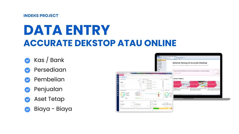 Indeks Project merupakan jasa training dan implementasi accurate dekstop atau online yang diajarkan oleh konsultan yang berpengalaman di berbagai jenis perusahaan, selain sebagai konsultan Indeks Project juga menawarkan jasa untuk data entry di accurate dekstop atau online