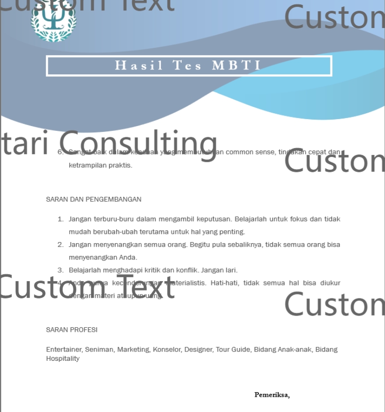 MBTI saat ini sangat populer di media sosial dan banyak orang yang mendapatkan berbagai manfaat dari tes MBTI. Jadi ayo jangan ketinggalan untuk tahu lebih dalam tentang kepribadian anda.. Kami dapat membantu anda untuk mengetahui jenis MBTI mana yang anda miliki. Serta dari hasil tes dapat memetakan kelebihan dan kekurangan diri anda, sebagai acuan untuk anda dalam memahami dan mengembangkan diri.. Alur pemesanan: ketika anda memesan maka kami akan mengirimkan link soal mbti untuk anda isi sesuai dengan apa yang ada rasakan. Kemudian hasil jawaban akan kami periksa dan laporan hasil MBTI akan diselesaikan dalam 1-2 hari dan akan dikirimkan kepada anda melalui email. kelebihan tes dengan kami: seluruh soal berbahasa indonesia dan hasil tes bisa sehari jadi. Tes MBTI dapat membantu dalam: * Memahami diri sendiri: Mengetahui kekuatan, kelemahan, dan preferensi pribadi. * Meningkatkan hubungan: Lebih memahami orang lain dan cara berinteraksi. * Memilih karir: Menemukan pekerjaan yang sesuai dengan kepribadian. * Mengembangkan diri: Menyadari potensi dan area yang perlu diperbaiki. * Mengambil keputusan: Membuat pilihan yang lebih baik berdasarkan pemahaman diri. Langkah Pekerjaan 1. Chat terlebih dahulu sebelum siap order untuk menentukan kapan klien siap mengisi tes psikologi mbti 2. Setelah order dan klien sepakat terkait waktu, maka link soal tes akan diberikan dalam bentuk link pengisian google form 3. Klien menyelesaikan pengerjaan tes dan di submit, maka hasil tes akan dianalisa dan laporan hasil tes diselesaikan di hari yang sama. dan akan dikirimkan melalui email klien dalam bentuk pdf