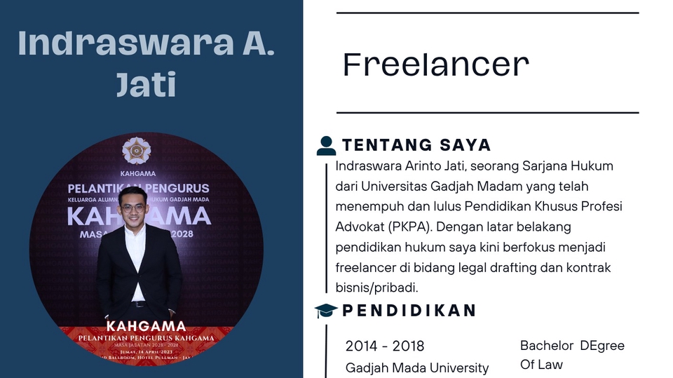 Perkenalkan, saya Indraswara Arinto Jati, seorang Sarjana Hukum dari Universitas Gadjah Mada, saya kini berfokus menjadi freelancer di bidang legal drafting dan kontrak bisnis. aya menawarkan jasa profesional dalam: - Pembuatan dan peninjauan kontrak (perjanjian kerja, perjanjian sewa, MoU, dll) - Legal drafting untuk kebutuhan pribadi maupun korporasi Silakan dapat menghubungi saya, terimakasih
