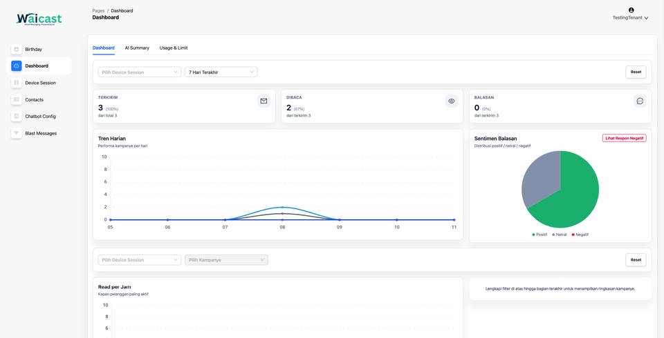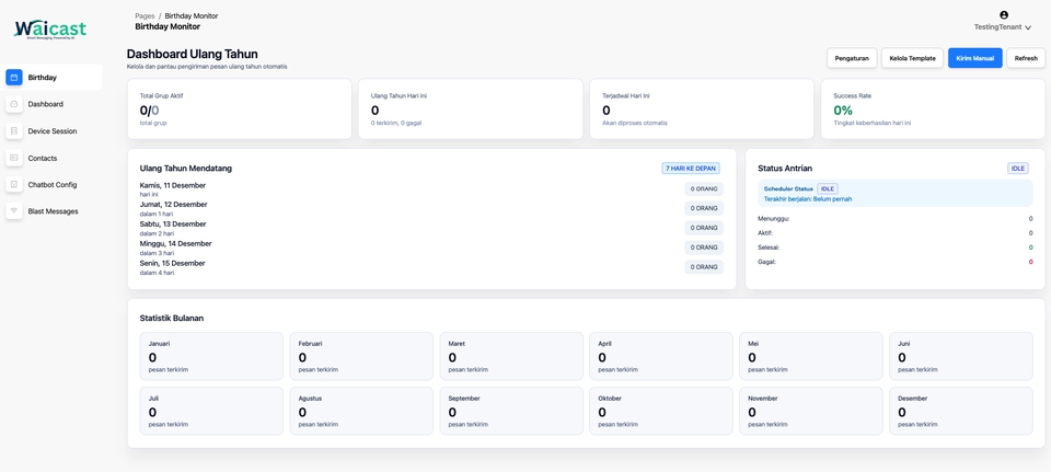 WAICAST hadir sebagai platform WhatsApp automation yang membantu bisnis mengelola komunikasi secara cepat, akurat, dan terukur. Dengan fitur lengkap dan antarmuka yang mudah digunakan, WAICAST mempercepat proses broadcasting, meningkatkan respon pelanggan, dan memudahkan pengelolaan kontak dalam skala besar. Fitur Utama WAICAST Automated Birthday Message Kirim ucapan ulang tahun secara otomatis kepada pelanggan, partner, atau anggota tim. Cukup buat template, atur jadwal kirim, dan WAICAST akan mengirimkannya secara otomatis. Dashboard Realtime Pantau performa pesan yang dikirimkan—mulai dari pesan terkirim, dibaca, hingga respon. Semua data tampil jelas sehingga memudahkan evaluasi kampanye. Device Session Connection Hubungkan WhatsApp Anda ke platform WAICAST dengan mudah melalui QR Scan. Setelah tersambung, Anda bisa mengelola chat langsung dari dashboard. Manajemen Kontak Lengkap Tambahkan kontak secara manual atau melalui CSV. Tersedia fitur validasi nomor, sync kontak, dan penambahan metadata untuk segmentasi yang lebih presisi. AI Chatbot Configuration Buat chatbot otomatis dengan berbagai tipe pemicu: Kata harus sama persis Mengandung kata kunci Respon otomatis untuk semua pesan Membantu meningkatkan kecepatan respon pelanggan 24/7. Blast Message Campaign Kirim pesan massal ke ribuan kontak dengan aman dan cepat. Anda dapat menambahkan teks, gambar, dokumen, maupun link, serta menjadwalkan pengiriman kapan saja.