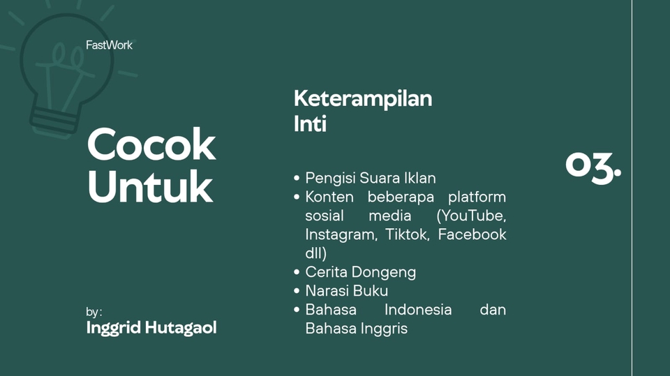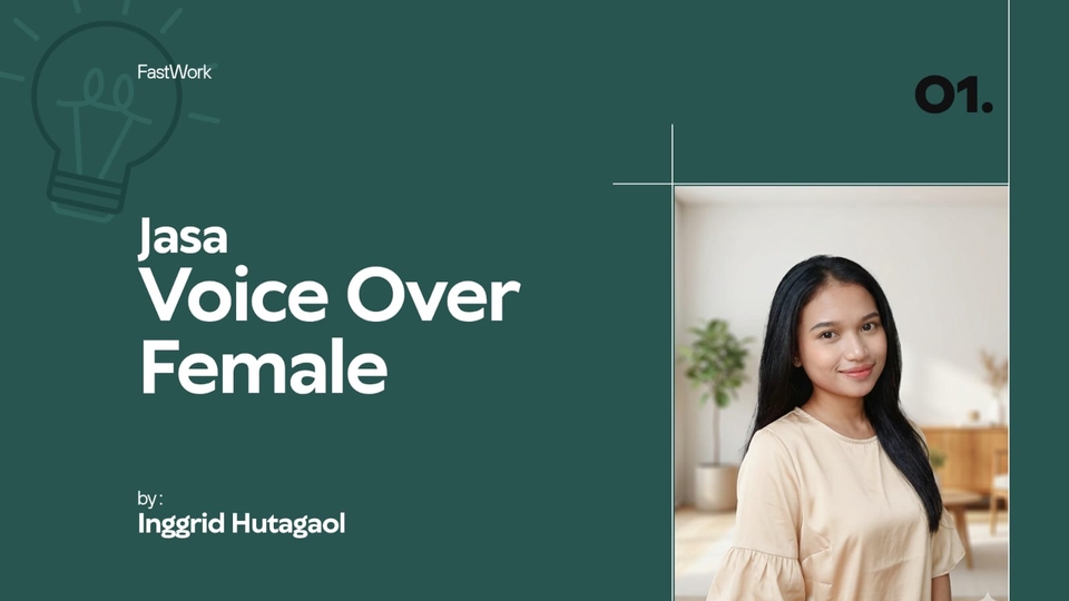 Apakah Anda mencari suara yang dapat menghidupkan cerita atau membuat iklan Anda lebih berkesan? Saya hadir untuk membantu memberikan nyawa pada konten visual Anda melalui karakter suara yang hangat, jernih, dan ekspresif. Layanan yang Saya Tawarkan: ● Cerita Dongeng & Narasi: Menghidupkan imajinasi anak-anak dengan intonasi yang bercerita, penuh perasaan, dan karakter yang unik. ● Iklan YouTube & Media Sosial: Suara yang persuasif dan enerjik untuk meningkatkan engagement konten TikTok, Instagram Reels, hingga iklan YouTube. ● Konten Edukasi/Explainer Video: Penyampaian materi yang jelas dan nyaman didengar agar informasi tersampaikan dengan maksimal. ● Company Profile: Memberikan kesan profesional dan elegan bagi citra perusahaan Anda. Cara Pemesanan: ● Kirimkan Naskah/Script yang sudah final. ● Berikan arahan mengenai mood/tone yang diinginkan (contoh: ceria, tenang, atau semangat). ● Saya akan mengirimkan demo singkat atau langsung mengerjakan hasil akhirnya untuk Anda.