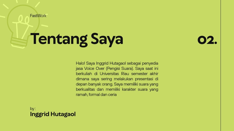 Saya adalah penyedia jasa Voice Over (Pengisi Suara) dan Pengetikan Cepat yang berkomitmen memberikan hasil kerja berkualitas tinggi, akurat, dan tepat waktu. - Memiliki karakter suara yang ramah dan formal - Mampu mengetik dengan ketelitian yang sangat baik.