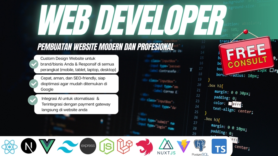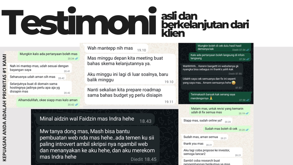 KEPUASAN ANDA ADALAH PRIORITAS #1 KAMI Deskripsi Layanan: Saya membantu Anda membangun website modern dan profesional yang bukan hanya enak dipandang, tetapi juga fokus pada konversi: lebih banyak yang chat, daftar, atau beli dari website Anda. Website dibuat custom, responsif di semua perangkat, cepat, aman, SEO-friendly, dan bisa diintegrasikan dengan AI serta payment gateway untuk mendukung penjualan dan otomatisasi bisnis Anda. APA YANG SAYA KERJAKAN Custom design website ⦁ Desain eksklusif, bukan template pasaran. ⦁ Disesuaikan dengan identitas brand / bisnis Anda. ⦁ Tata letak rapi, modern, dan mudah digunakan pengunjung. Full Responsif (Mobile–Tablet–Laptop–Desktop) ⦁ Tampilan menyesuaikan ukuran layar secara otomatis ⦁ Nyaman diakses dari HP, tablet, maupun komputer/laptop Cepat, aman, SEO & conversion-friendly ⦁ Website dioptimasi agar ringan dan cepat diakses ⦁ Menggunakan praktik dasar keamanan yang baik ⦁ Struktur siap untuk SEO agar mudah ditemukan di Google ⦁ Fokus pada user flow dan CTA yang jelas untuk mendorong konversi (lebih banyak lead, chat, atau transaksi) Integrasi AI dan payment gateway ⦁ Integrasi AI untuk otomasi: chatbot, form pintar, rekomendasi, dan sejenisnya ⦁ Integrasi payment gateway sehingga pelanggan bisa bayar langsung di website (cocok untuk penjualan produk/jasa) Maintenance dan pengembangan lanjutan (opsional) ⦁ Bantuan update konten ⦁ Pengembangan fitur tambahan ke depan sesuai kebutuhan bisnis TEKNOLOGI YANG DIGUNAKAN Saya menggunakan stack modern dan fleksibel, antara lain: ⦁ Frontend: React, Next.js, Vue, Nuxt.js ⦁ Backend: Node.js, Express, Laravel ⦁ Database: PostgreSQL / MySQL (sesuai kebutuhan) ⦁ Bahasa dan tools pendukung: JavaScript, TypeScript, integrasi API, dan lain-lain Semua akan dipilihkan sesuai kebutuhan bisnis dan skala website Anda, bukan asal pakai teknologi. COCOK UNTUK SIAPA Layanan ini cocok untuk: ⦁ UMKM dan bisnis lokal ⦁ Toko online / eCommerce ⦁ Perusahaan jasa dan konsultan ⦁ Sekolah, lembaga kursus, atau platform LMS ⦁ Personal brand, kreator, dan influencer ⦁ Perusahaan level enterprise yang membutuhkan solusi lebih custom KELEBIHAN DIBANDING WEBSITE WORDPRESS BIASA Banyak bisnis memulai dengan WordPress, tetapi untuk kebutuhan yang lebih serius dan ingin tampil beda, website custom punya banyak keunggulan: ⦁ Performa lebih cepat dan ringan Tidak terbebani banyak plugin dan tema generik, sehingga website lebih cepat dan stabil. ⦁ Desain benar-benar custom Bukan tema yang dipakai ribuan website lain. Tampilan dibuat mengikuti brand dan alur bisnis Anda. ⦁ Lebih aman dan minim masalah plugin Risiko bug atau celah keamanan karena plugin berlebihan jauh lebih kecil, karena stack lebih terkontrol. ⦁ Integrasi AI dan fitur kompleks lebih fleksibel Fitur seperti chatbot AI, rekomendasi cerdas, dan otomatisasi form lebih leluasa dibuat di stack modern (React/Next/Nuxt + Node, dan sejenisnya) dibanding dipaksa lewat plugin. ⦁ Lebih mudah di-scale untuk jangka panjang Struktur kode rapi dan modular, sehingga ketika bisnis berkembang, website bisa ikut tumbuh tanpa menjadi lambat karena penambahan plugin terus-menerus. ⦁ Arsitektur mengikuti kebutuhan bisnis, bukan sebaliknya Alur website dibuat mengikuti proses di bisnis Anda (order, booking, konsultasi, pembayaran, dan lain-lain), bukan sekadar menyesuaikan tema yang sudah ada. KENAPA MEMILIH SAYA ⦁ Fokus pada hasil dan konversi, bukan hanya tampilan ⦁ Menggunakan stack modern yang scalable untuk jangka panjang ⦁ Komunikasi jelas dan rapi, tidak ribet secara teknis ⦁ Telah dipercaya klien dari berbagai skala, mulai dari UMKM hingga perusahaan level enterprise, dengan testimoni asli dan berkelanjutan ⦁ Menawarkan harga yang lebih terjangkau dibanding standar harga pasar ALUR KERJA PROYEK 1. Konsultasi singkat (gratis) Anda menjelaskan kebutuhan, jenis bisnis, dan fitur yang diinginkan. 2. Perencanaan dan penawaran Saya buatkan usulan struktur halaman dan estimasi waktu serta biaya. 3. Desain dan pengembangan Pembuatan desain dan implementasi website sesuai kesepakatan. 4. Revisi (sesuai paket) Perbaikan minor berdasarkan feedback Anda. 5. Launch dan serah terima Website dipasang di hosting/domain Anda dan disertai panduan singkat penggunaan. APA YANG PERLU ANDA SIAPKAN Agar proses lebih cepat dan terarah, mohon siapkan: ⦁ Nama brand / usaha ⦁ Logo (jika sudah ada) ⦁ Warna atau gaya yang diinginkan ⦁ Contoh website referensi (jika ada) ⦁ Konten dasar: teks profil, deskripsi layanan/produk, dan kontak yang digunakan ⦁ Fitur khusus yang ingin dimasukkan (AI, payment, form tertentu, dan lain-lain) Testimoni bisa Anda cek di slide terakhir. Kepercayaan dan kepuasan pelanggan adalah prioritas nomor satu bagi kami.