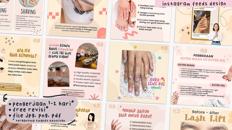 Rp299,9 rb> Jumlah desain : 7 file (size instagram feeds 1:1) > revisi (tiap file) maksimal 2x > hasil akhir JPG/PNG * revisi tidak merubah konsep awal, revisi minor (seperti warna, jenis font, atau peletakan elemen)